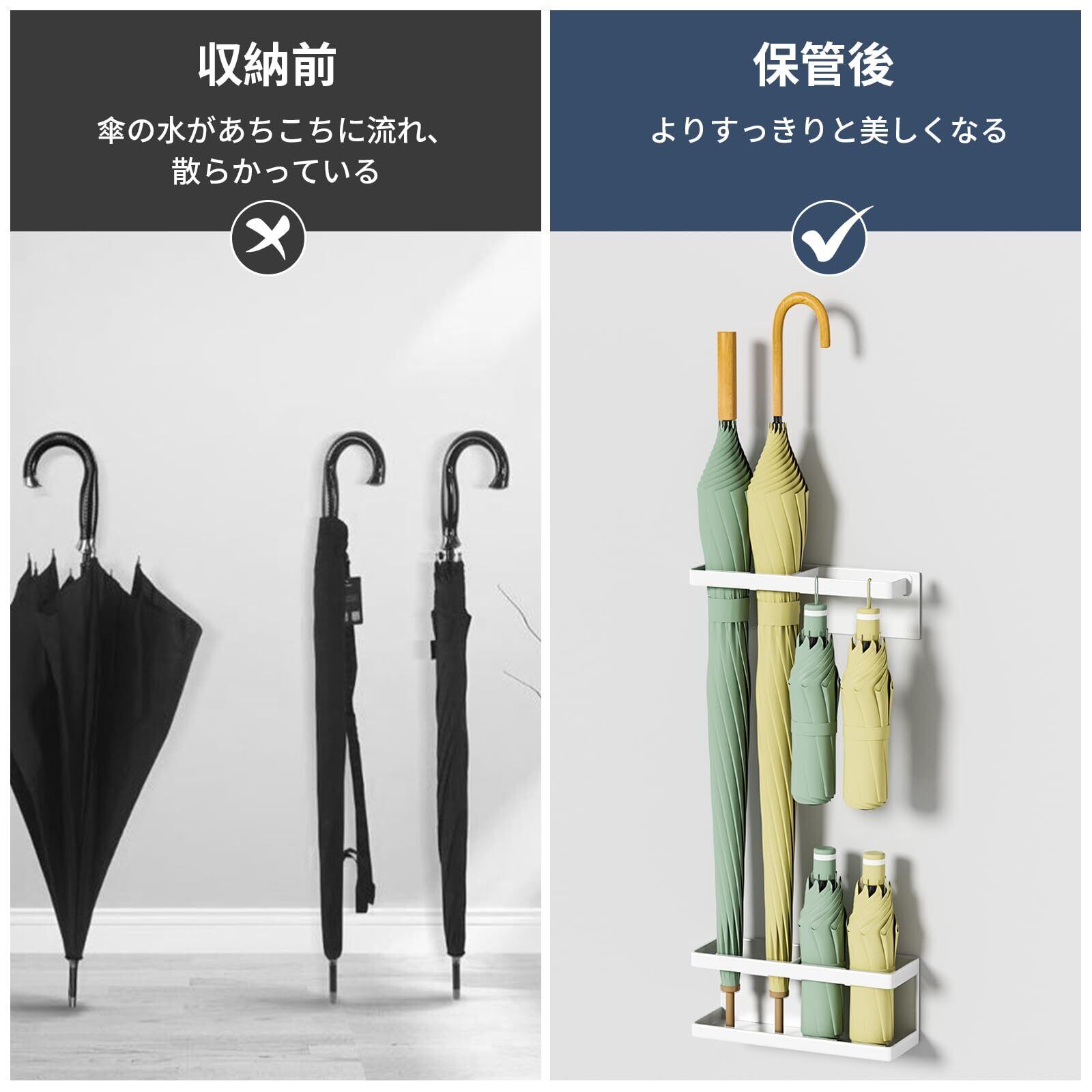 傘立て マグネット フック付き アンブレラスタンド 玄関収納 傘入れ トレー付き 多機能傘収納 玄関の壁掛け式 ホワイト