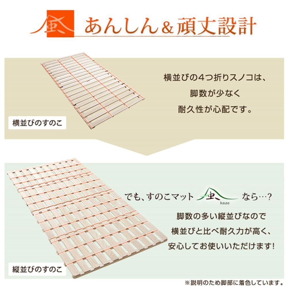 【備考】 ※敷いたまま無理に引きずると床に傷がつく恐れがありますので、ご注意ください。 【ご使用上の注意】 ※すのこの上に立つ場合はさん木の上に足をかけるなど強度の弱い部分に体重がかからないようにご注意ください。 ※飛び跳ねたり、一点に荷重をかけたりすると割れる恐れがあります。 ※固綿入りの厚手の敷布団や、マットレスでの使用を奨励しています。 ※1カ所に力が加わるようなご使用で破損した場合、取扱い説明書の注意をお守り頂いていない場合などは、返品・交換の対象外となりますので、予めご了承ください。 ※2022年12月8日にすのこの厚み、サイズの仕様を一部変更しました。