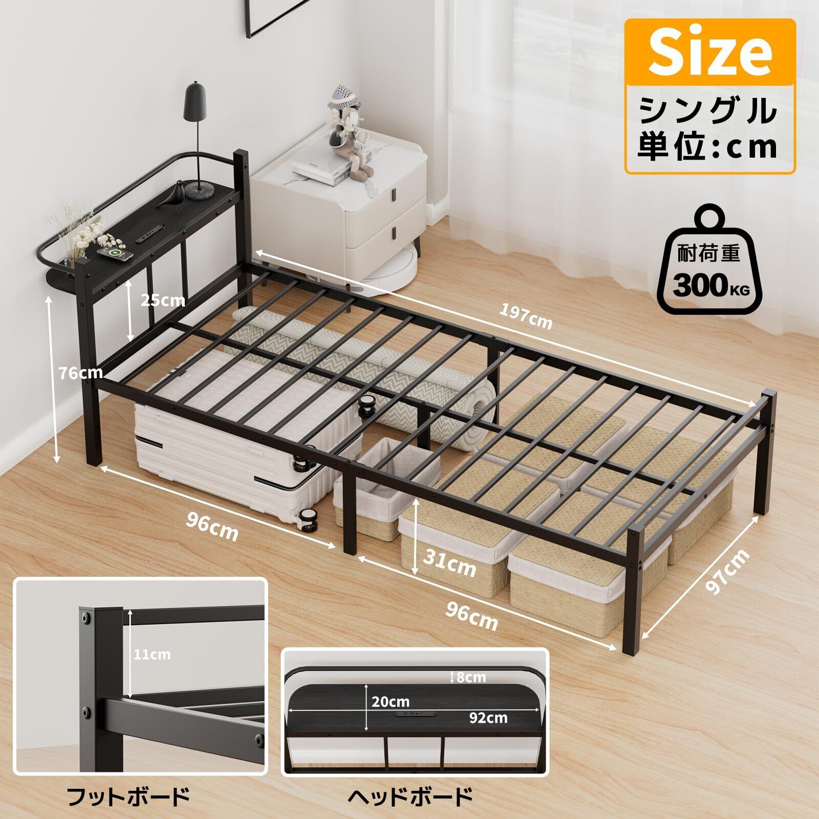 【サイズ】幅98×長225さ×高さ76cm、ベッド下高さ31cm、コードの長さ:180cm【フレーム材質】スチール(鋼製+粉体塗装)、MDFボード 【耐荷重】約300kg【重量】約18.6kg 【梱包サイズ】13×35×108cm