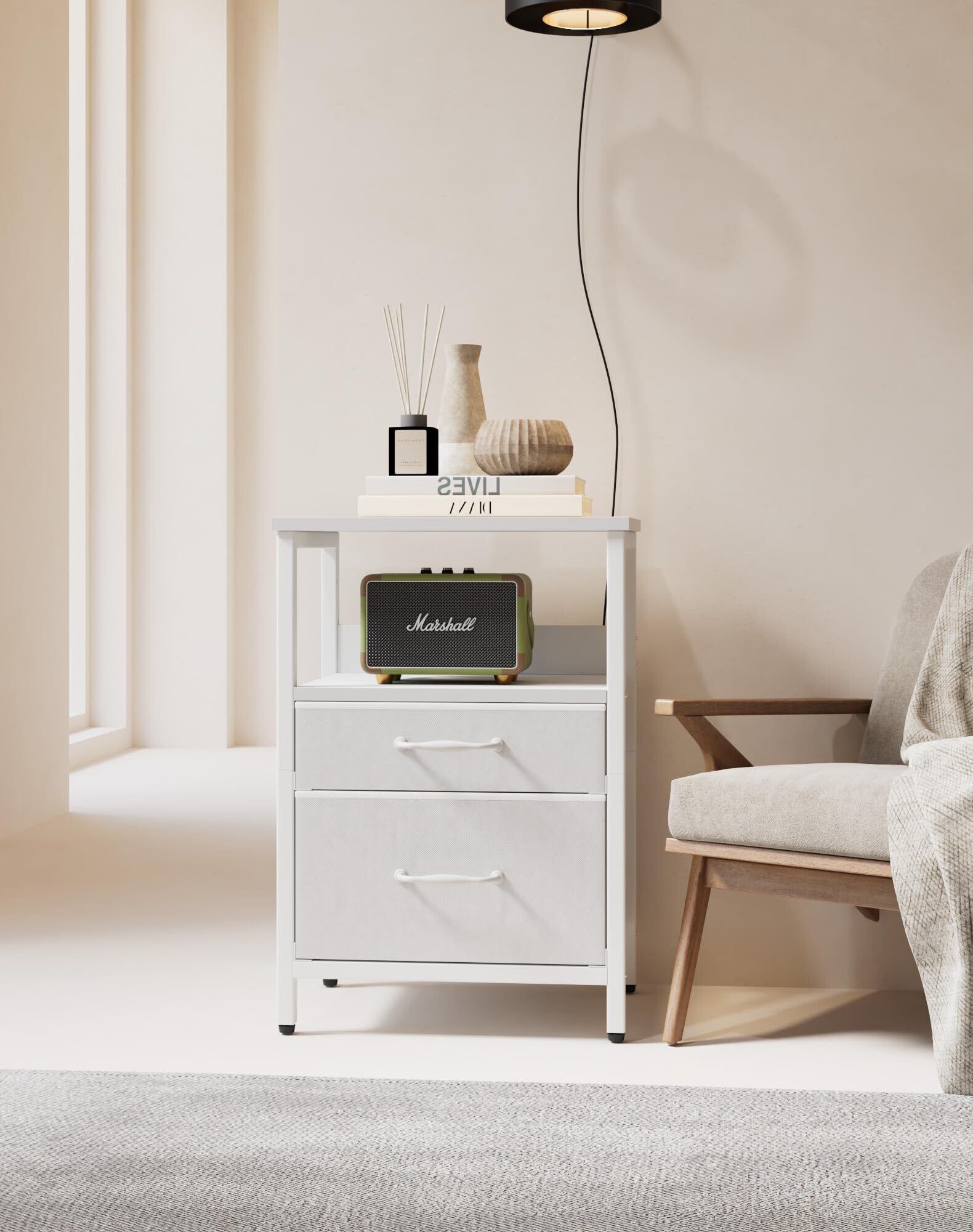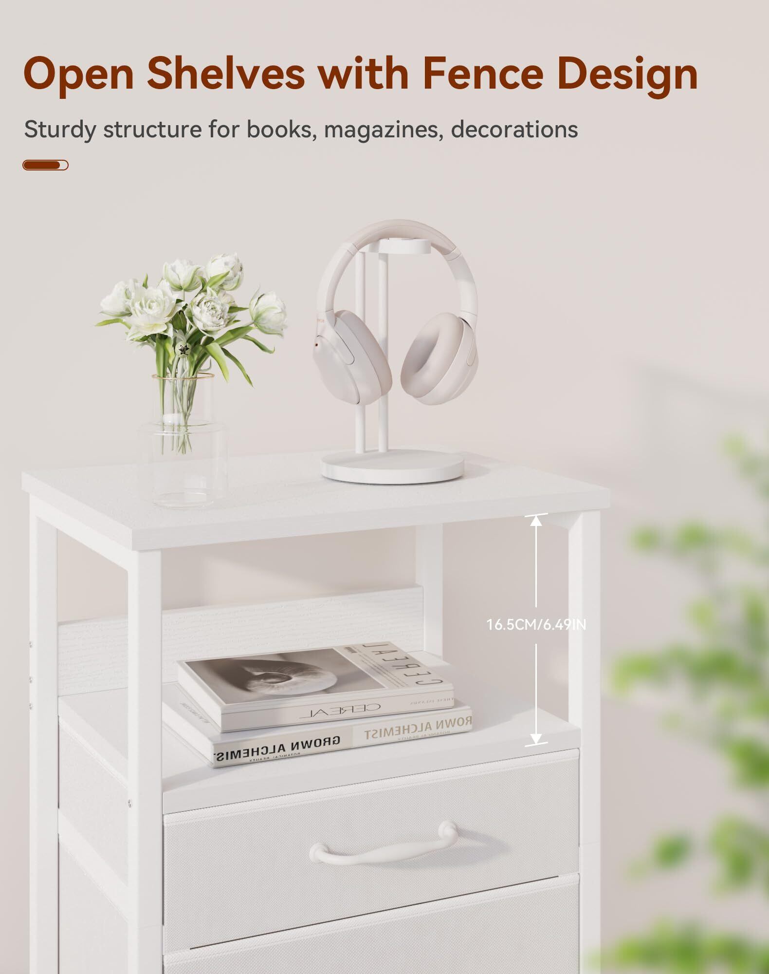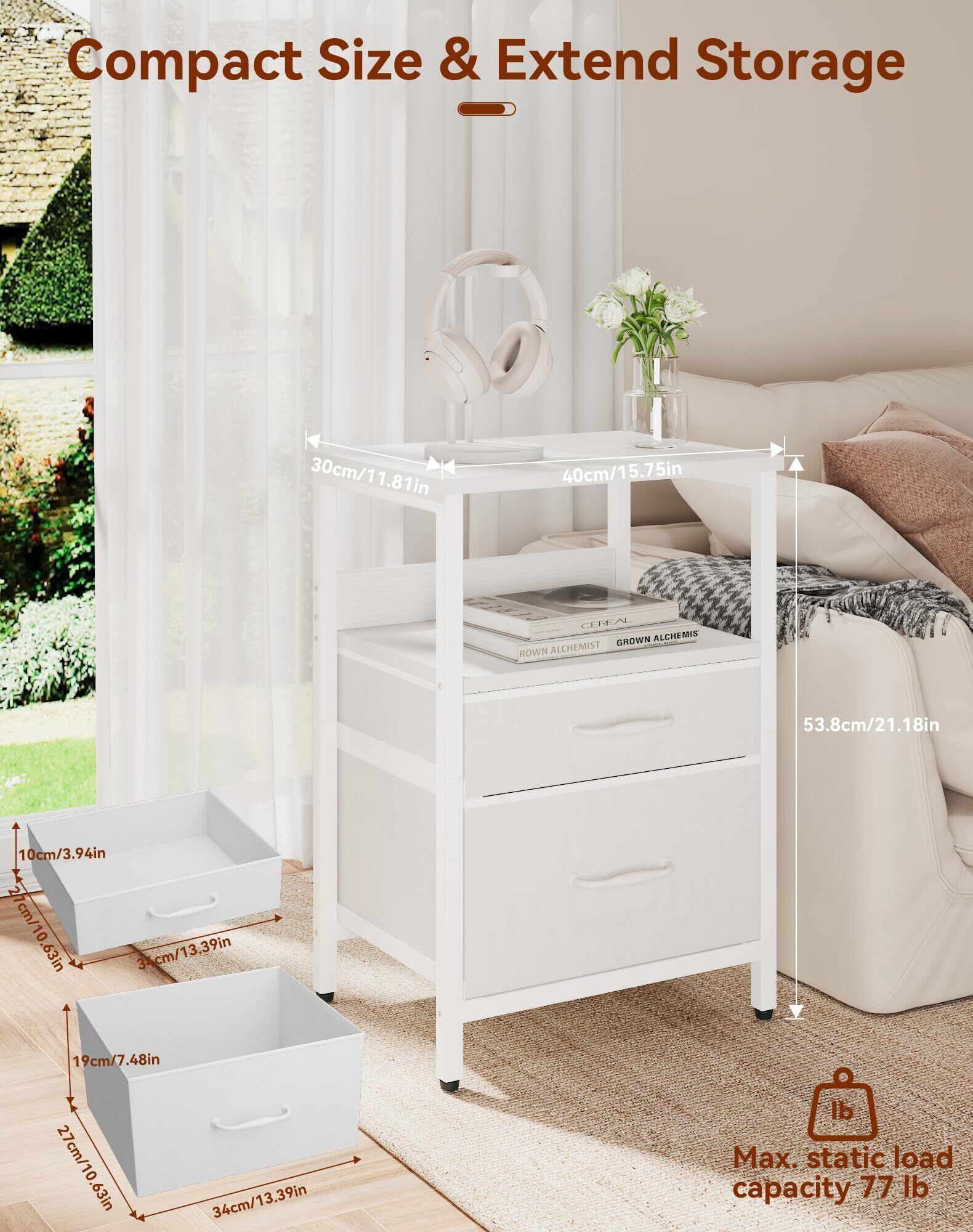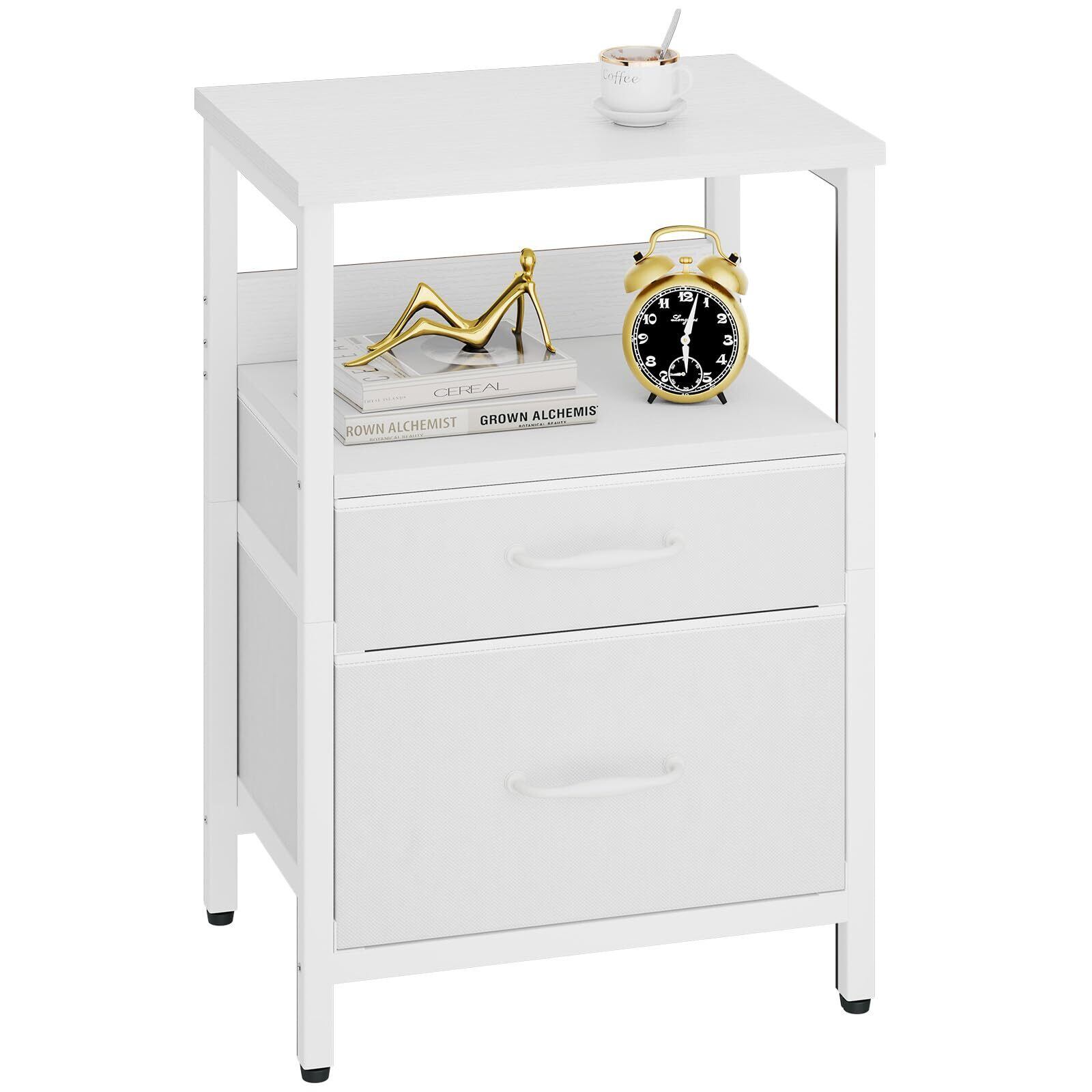 YMYNY サイドテーブル ナイトテーブル ファブリック引き出し付き 木目 アイアン&木製 組み立て簡単 コンパクト ナイトスタンド ベッドサイドテーブル ベッド横 ソファー横 ホワイト HST011W
