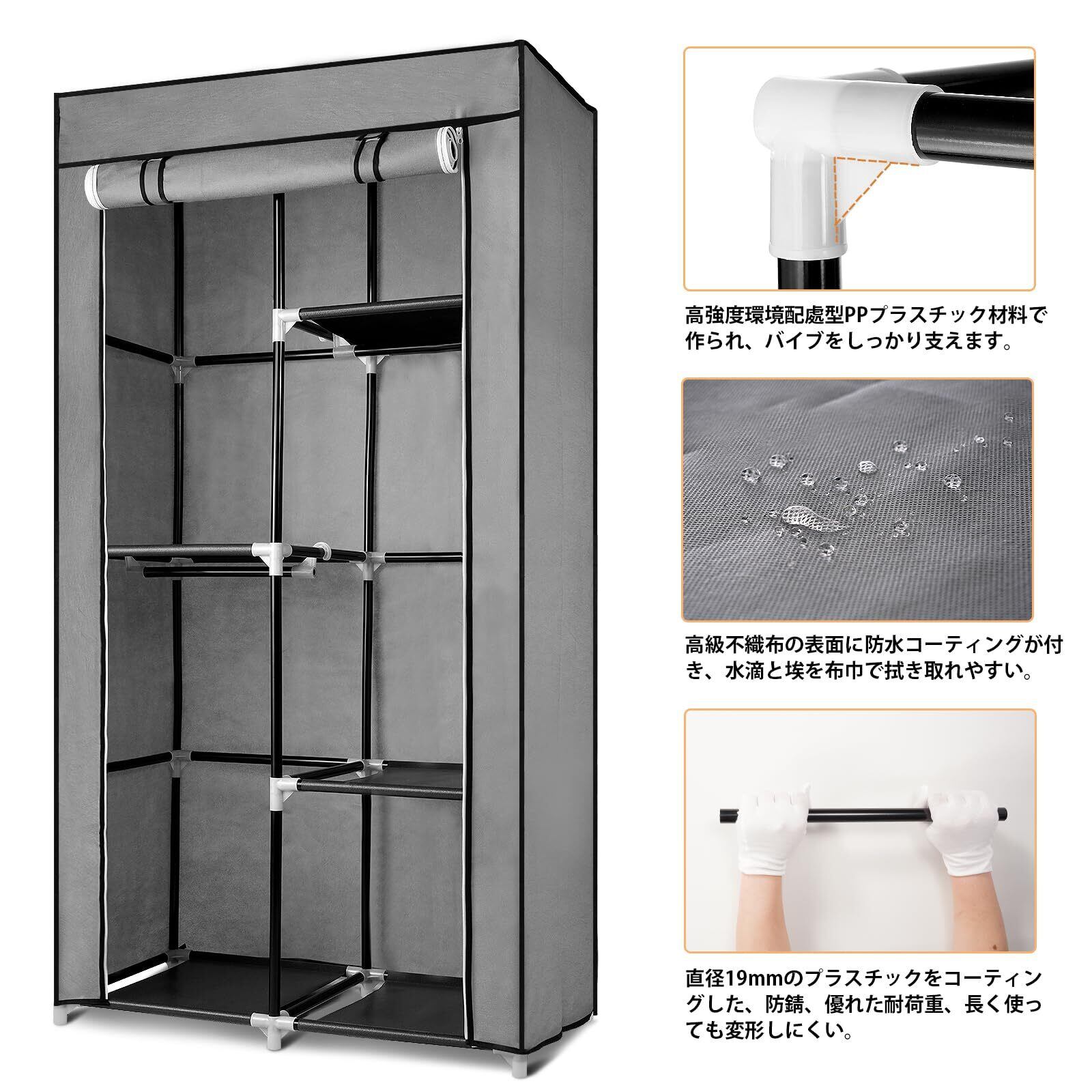 【組み立て簡単、女性一人でもOK】女性の方は一人でも簡単で楽に組み立てできます。説明書付属します、パイプを連結パーツで繋げて、カバーがラックに覆うだけ!組立式収納棚は強固に改良しました。防水の厚や通気性の良い不織布、強化プラスチックの接続口。