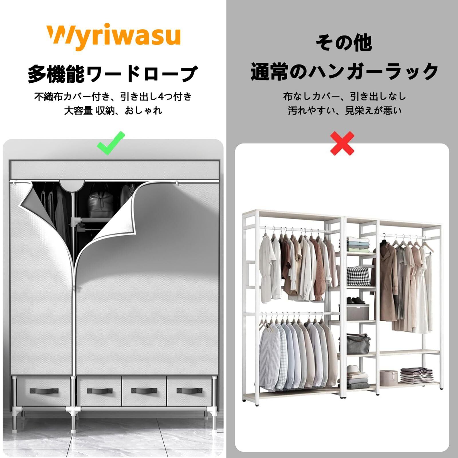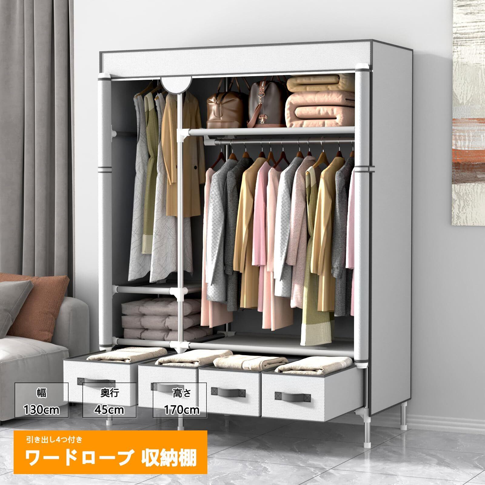 ワードローブ カバー付き クローゼット 引き出し4つ付き 大容量 収納 おしゃれ 不織布 簡単組み立て 多機能 ハンガーラック 収納棚 耐久 頑丈 防水 防塵 防汚 省スペース 幅130×奥行45×高さ170cm (ライトグレー)