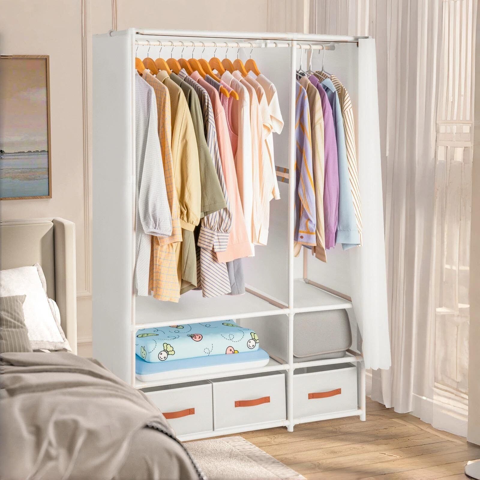 2 列棚ワードローブ 組立式 大容量 ハンガーラック 布製 洋服整理 引き出し付き カバー 収納ボックス対応 省スペース 多層構造 ホワイト