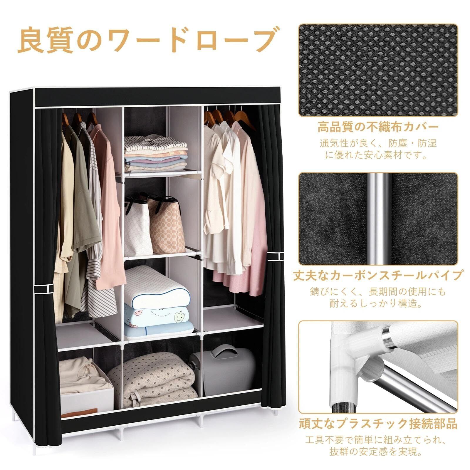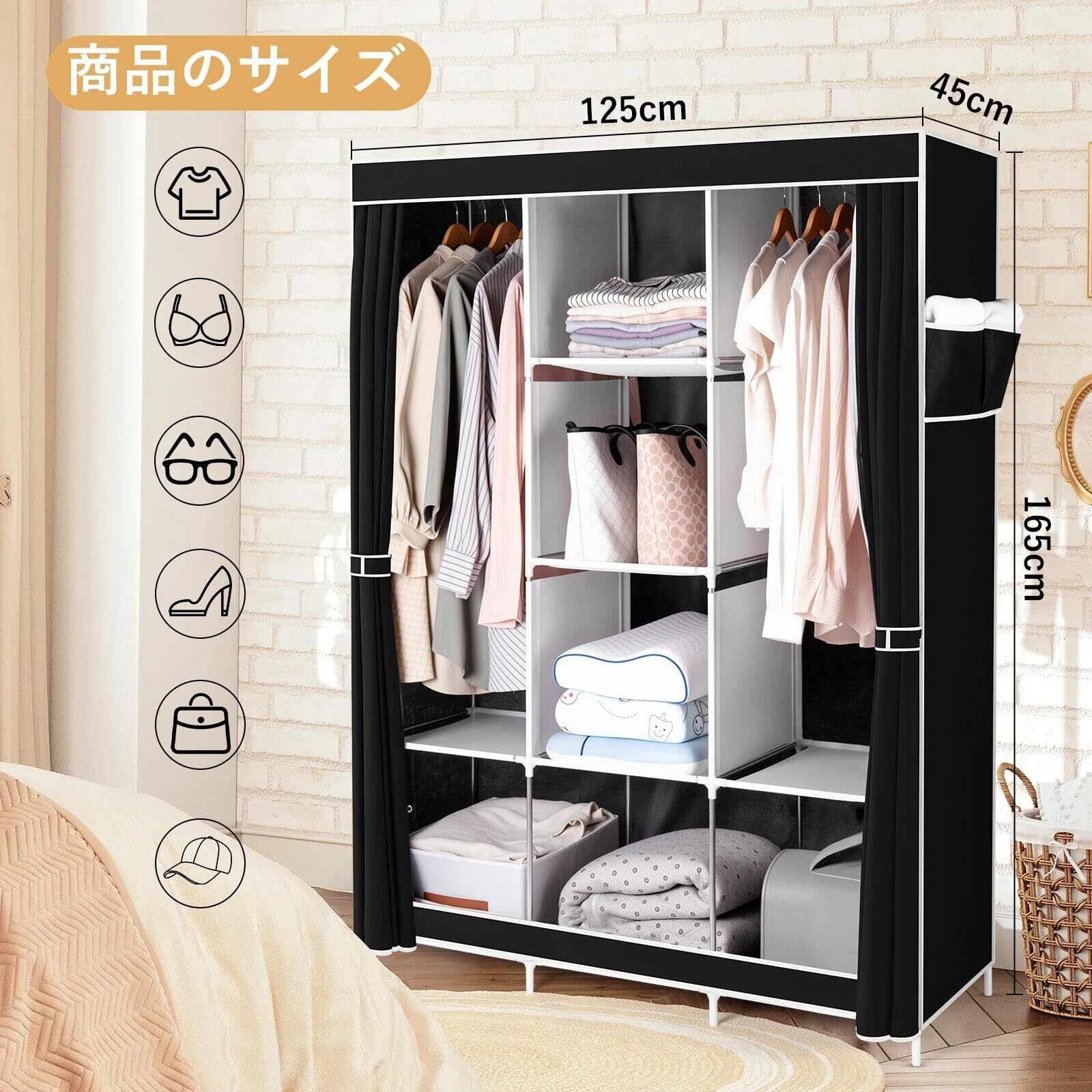ポータブル組立式クローゼット 簡単設置 防湿・防塵・防カビ 衣類収納 多層キャビネット 寮・寝室用 幅128×奥行45×高さ170cm 黒