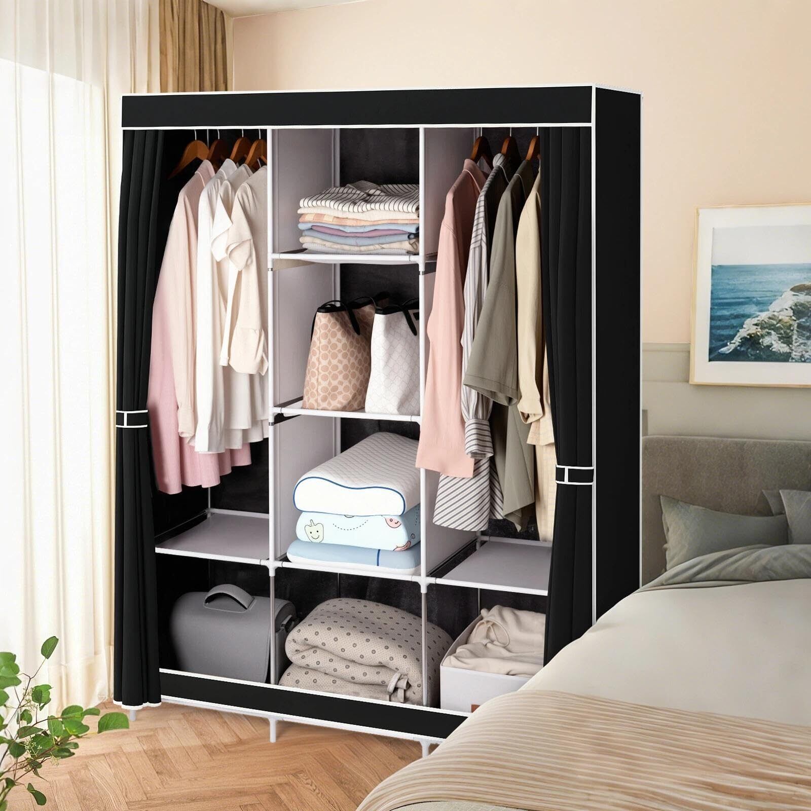 \【◆ポータブル組立式クローゼット 簡単設置 防湿・防塵・防カビ 衣類収納 多層キャビネット 寮・寝室用 幅128×奥行45×高さ170cm 黒】理想的な収納スペースを実現しよう!/
