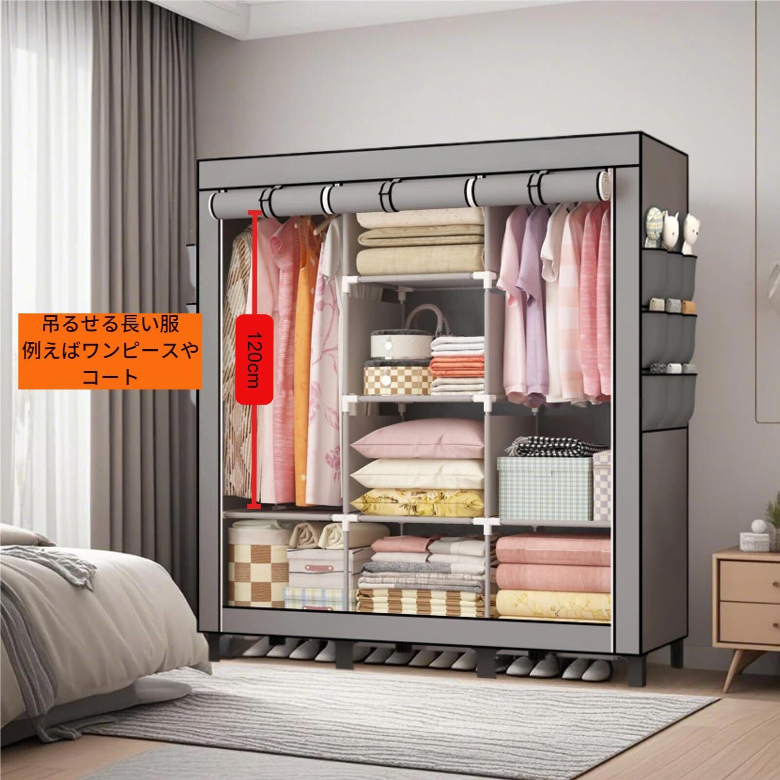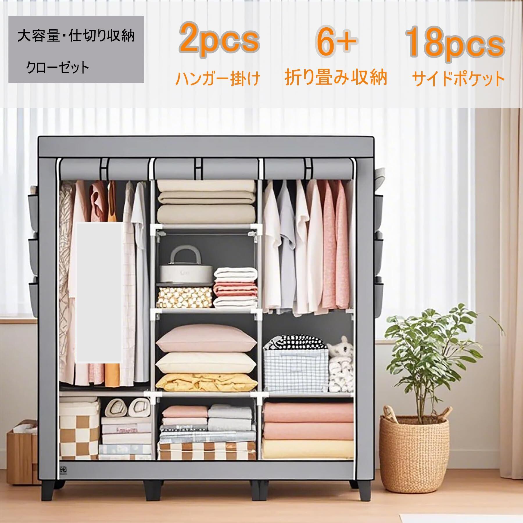 【大容量 & 多機能なクローゼット 収納】当社のワードローブは、本格的なクローゼットと同等の大容量を備えながら、ハンガーラック カバー付きの軽量デザインを採用。内部には 2 つの 120cm 超長ハンギングエリアを設置し、ロングコートやワンピースドレスをシワなく吊るすほか、6 層のプラスチック置物棚で布団・靴・バッグを整然と収納。側面の 18 個のポケットは小物やファンシーケースの分類に最適化され、天板には旅行用スーツケースを置ける広さを確保して、空間を最大限に活用したクローゼット 収納を実現します