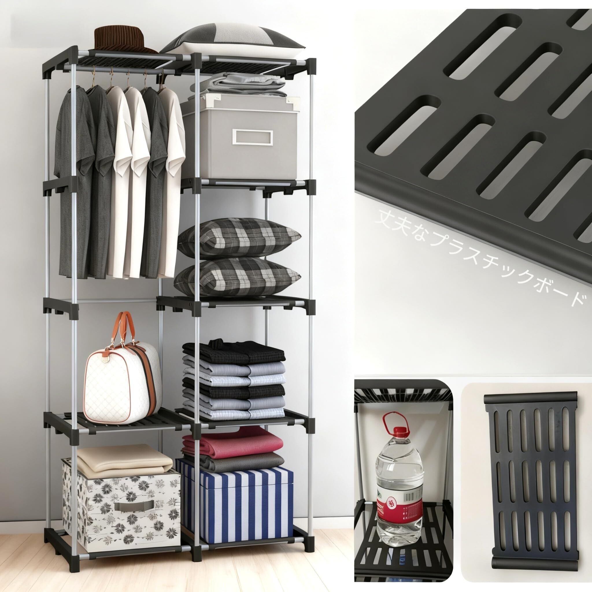 ✨【6段の多段式デザインで、衣類をたっぷり収納でき、スーツからカジュアルまで幅広く対応できます!】洋服掛け部分にはコートやジャケットをしっかりかけられ、下部にはパンツや小物をスマートに整理できます。