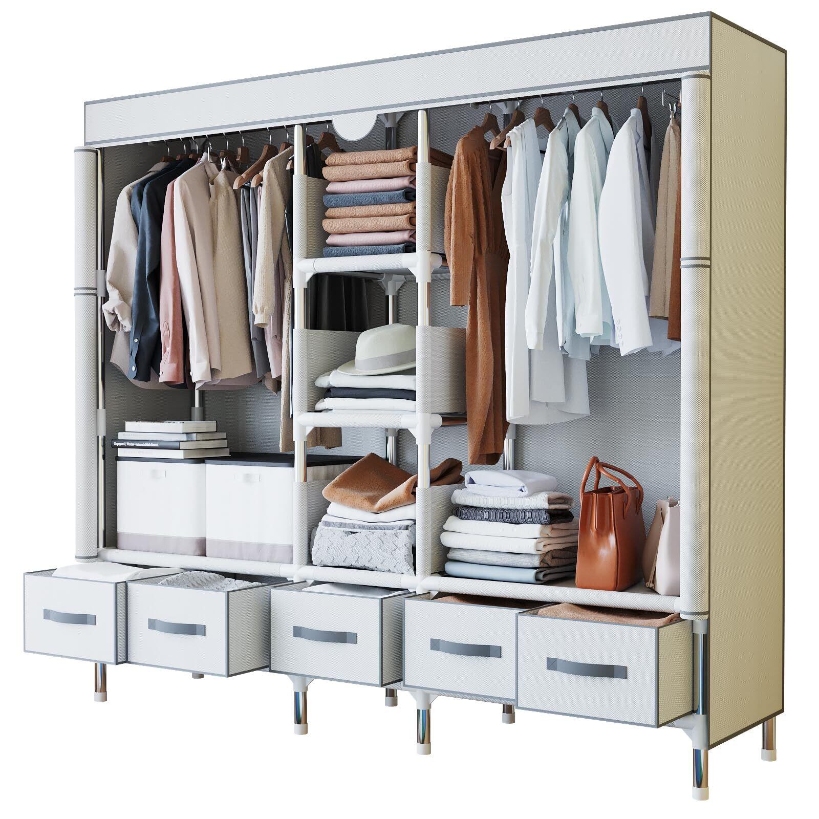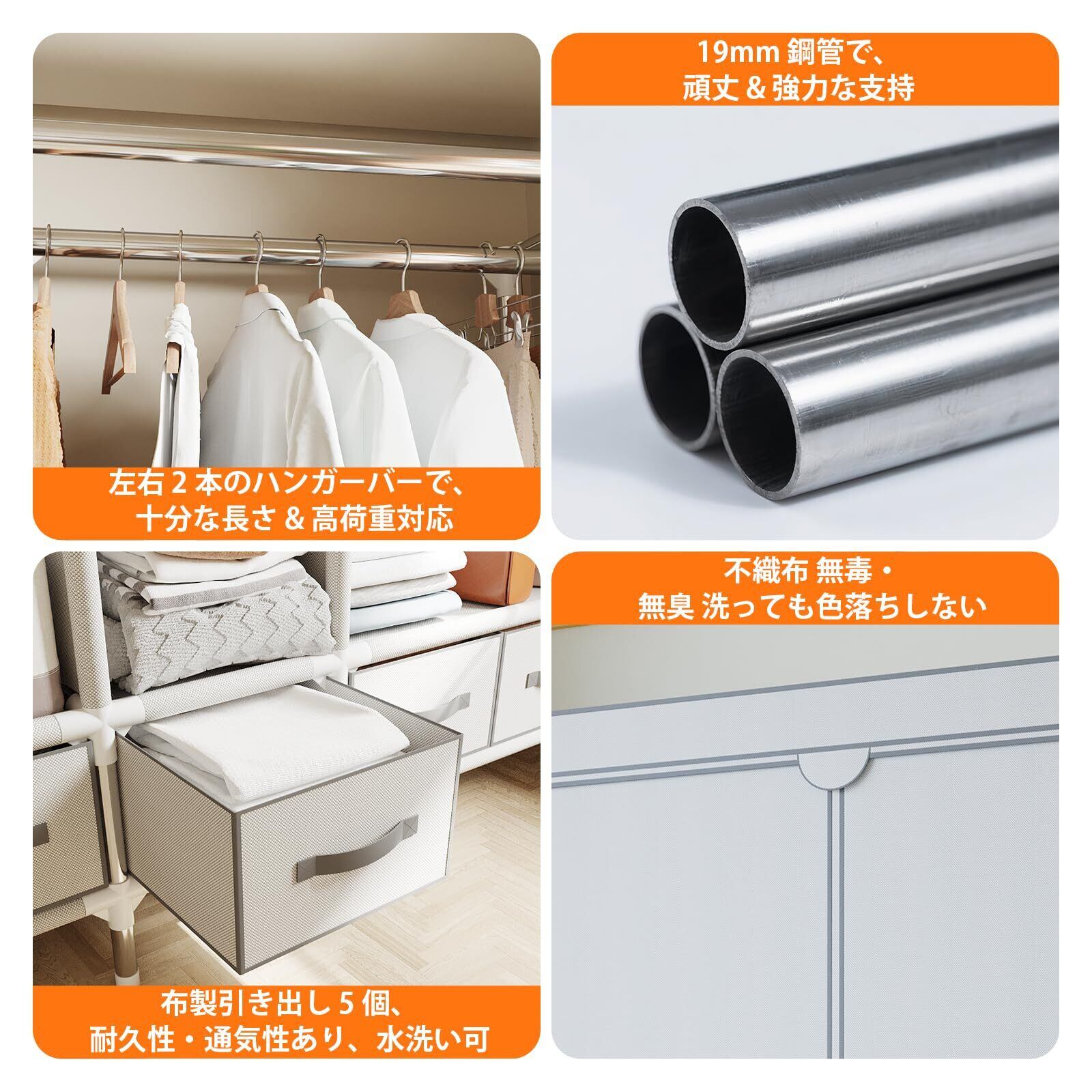 【大容量収納と 5 つの引き出し】このワードローブは左右にハンガーバーを 2 本備え、中央に棚、下部に 5 つの布製引き出しを配置。洋服、雑貨、下着などを分類収納でき、収納スペースを最大限に活用します。引き出しは布製で軽量かつ通気性があり、小物の整理に便利です。