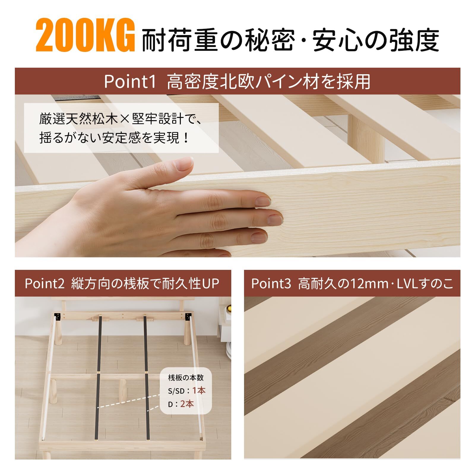 【耐荷重200kg・頑丈で静かな構造】高強度の北欧松木フレームと補強設計により、200kgの耐荷重を実現。独特のフレーム構造に縦方向の補強桟板を組み合わせることで、圧力分散設計を実現しています。すのこには厚さ12mmのLVL積層合板を採用し、耐久性と安定性をさらに高めています。しっかりとした構造が安定感と静音効果を両立し、毎晩安心して眠れます、長く安心してご使用いただけるベッドフレームです。