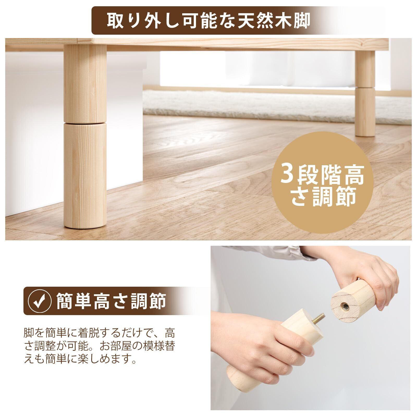 【高さ3段階調整機能】ベッドの高さは部屋のスタイルに合わせて3段階で調整できます。フレームの脚部は北欧無垢パインを使用しており、ベッド全体をしっかりと支えます。また、ベッド本体と脚部には傷防止フェルトが取り付けられており、床を傷つけることなく保護します。