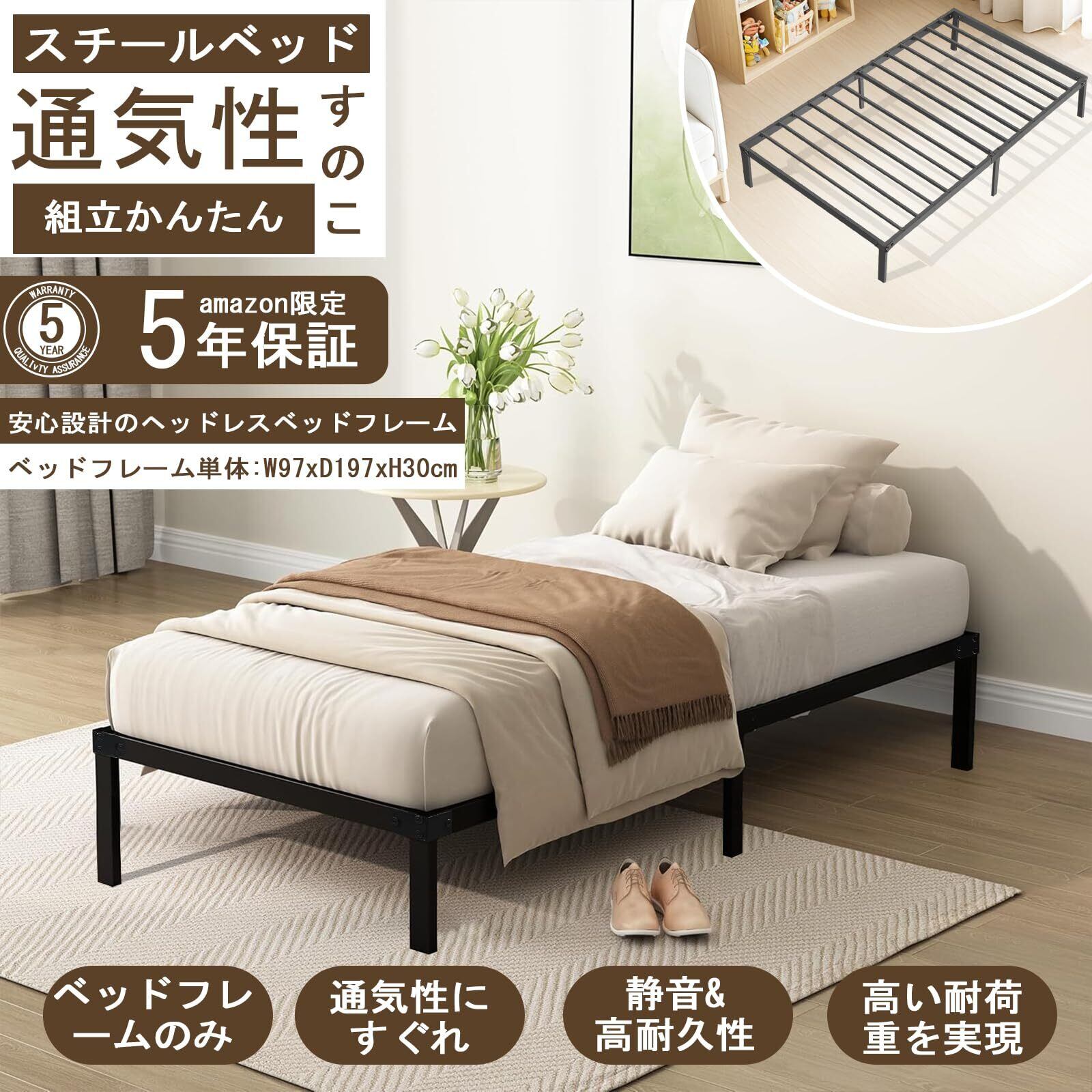 ベッドフレーム シングル 単品 シングルベッド ハイスタイル 耐荷重300kg ヘッドレス メタル ベッド フレーム 幅約97×長さ約197cm×高さ約30㎝ 頑丈 パイプベッド 耐久性 通気性 組立簡単 5年安心
