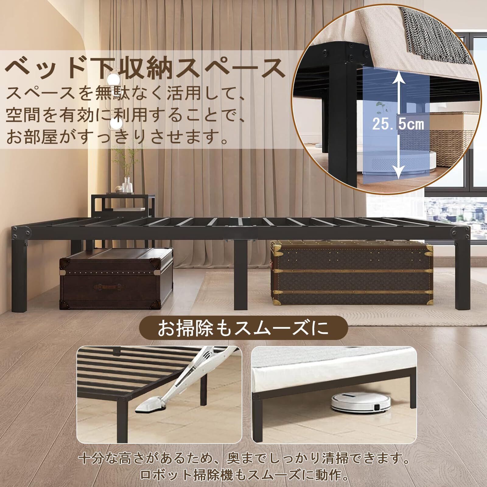 【たっぷりな床下収納スペース】ベッドフレーム下25.5cmの十分な高さで、収納スペースとしても活用でき、時節外れの服や布団、普段使わない荷物の収納に最適でお部屋はスッキリ!掃除機やロボット掃除機などを自由に出入りさせ、お掃除も楽々!