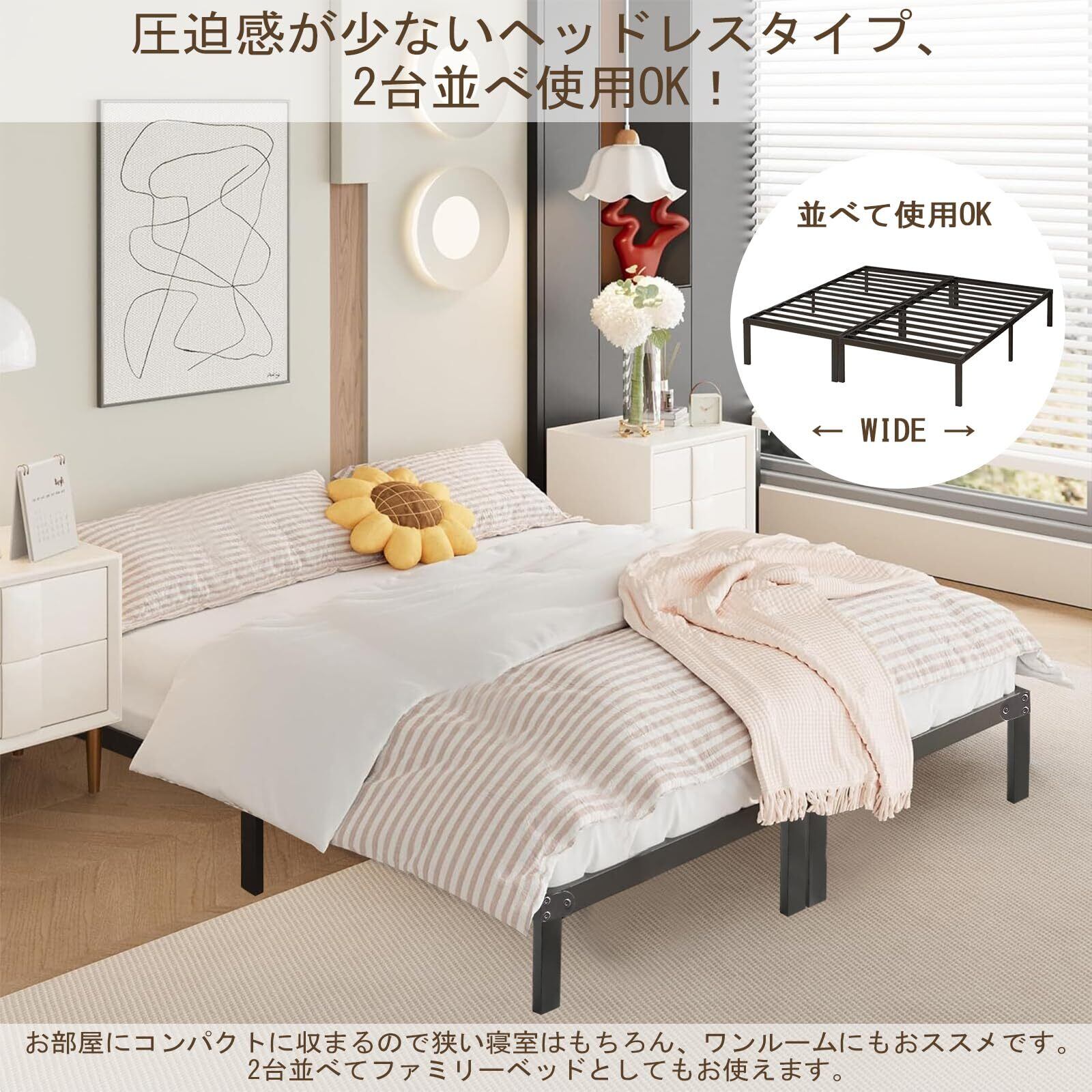 【どんなお部屋にも合う!シンプルデザイン】ヘッドレスで、お部屋の圧迫感が軽減され、広々と開放感が生まれます!シングルベッドを二つ組み合わせればキングサイズに家族3人でゆったりと眠れます。高すぎず低すぎず、誰にでもお勧めできる高さです。