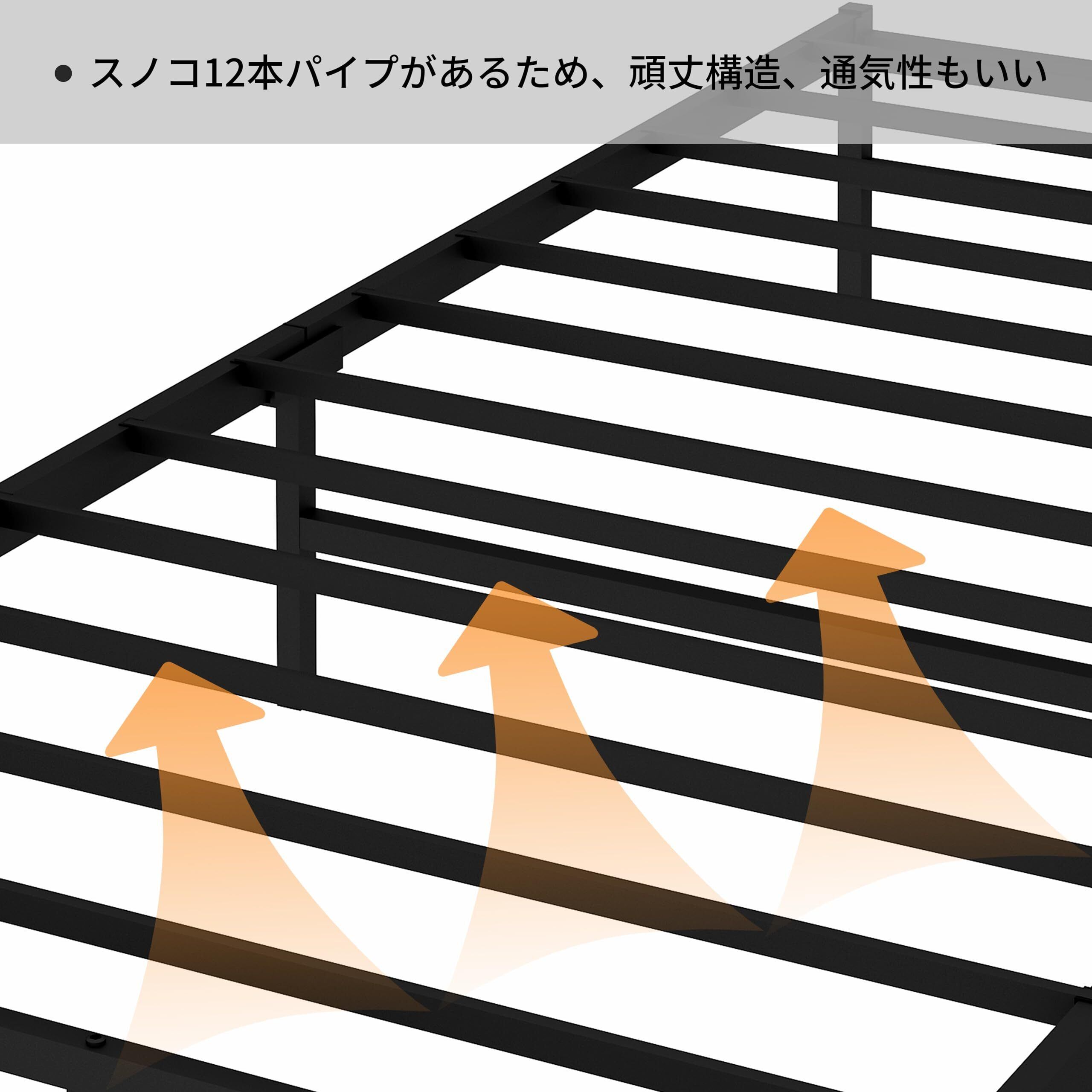 【安全構造】日本デザインの安全構造で、スノコ部分は400kg、サイドフレームは350kgの高い耐荷重性能を備えています。ベッドフレームにはスチール材(エポキシ樹脂塗装)を採用し、耐久性に優れています。通気性に優れたスノコ構造と静音設計を採用。厚いパイプを使用しているため、がたつきやきしみ音が一切なく、静かな睡眠環境をできます。