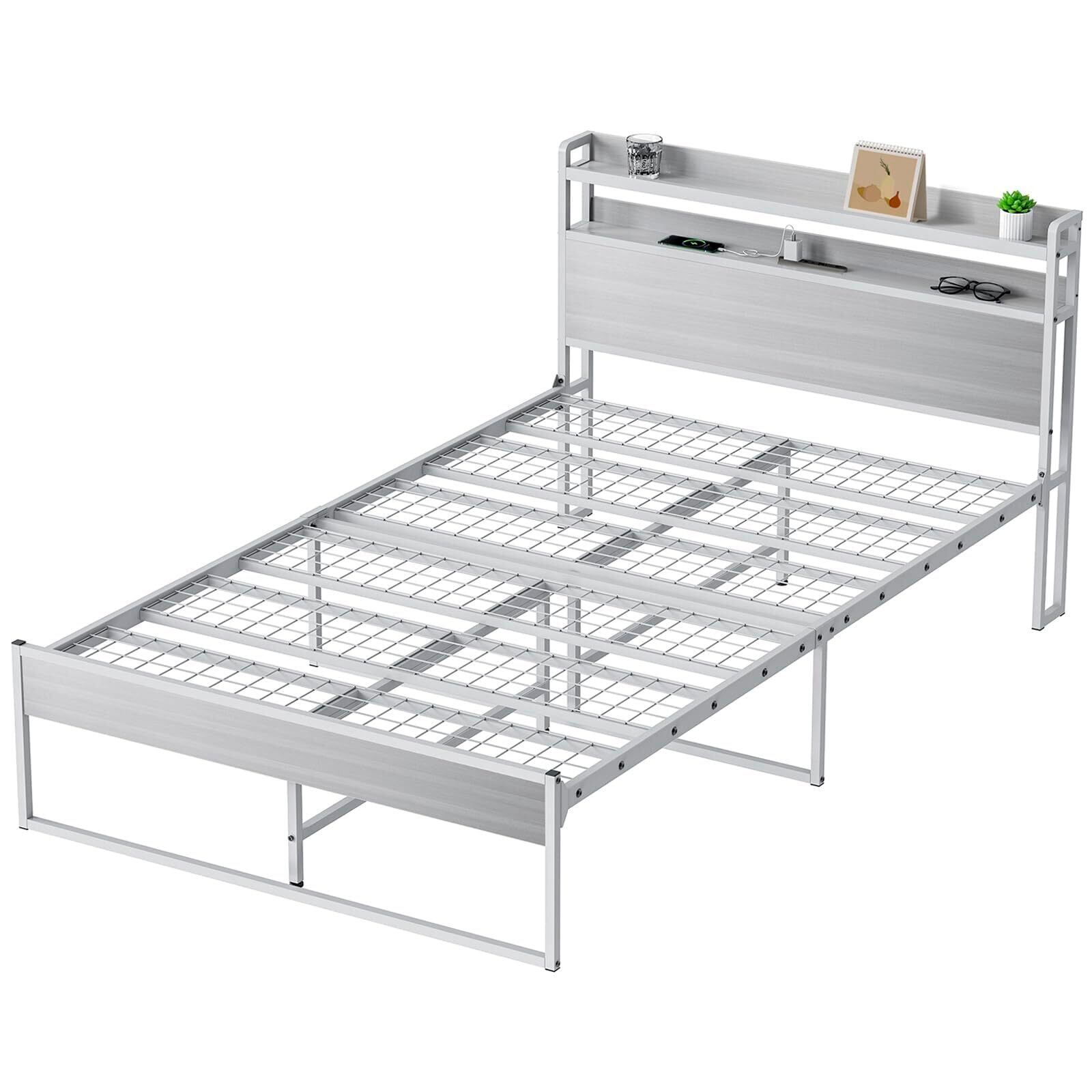 USB&2口コンセント ベッドフレーム 2段宮棚付き パイプベッド 高耐荷重 収納付きベッド スチールベッド カビ防止 アイアンベッド 脚付き フレームのみ セミダブルベッド 頑丈 木製 (アッシュグレー×グレー)