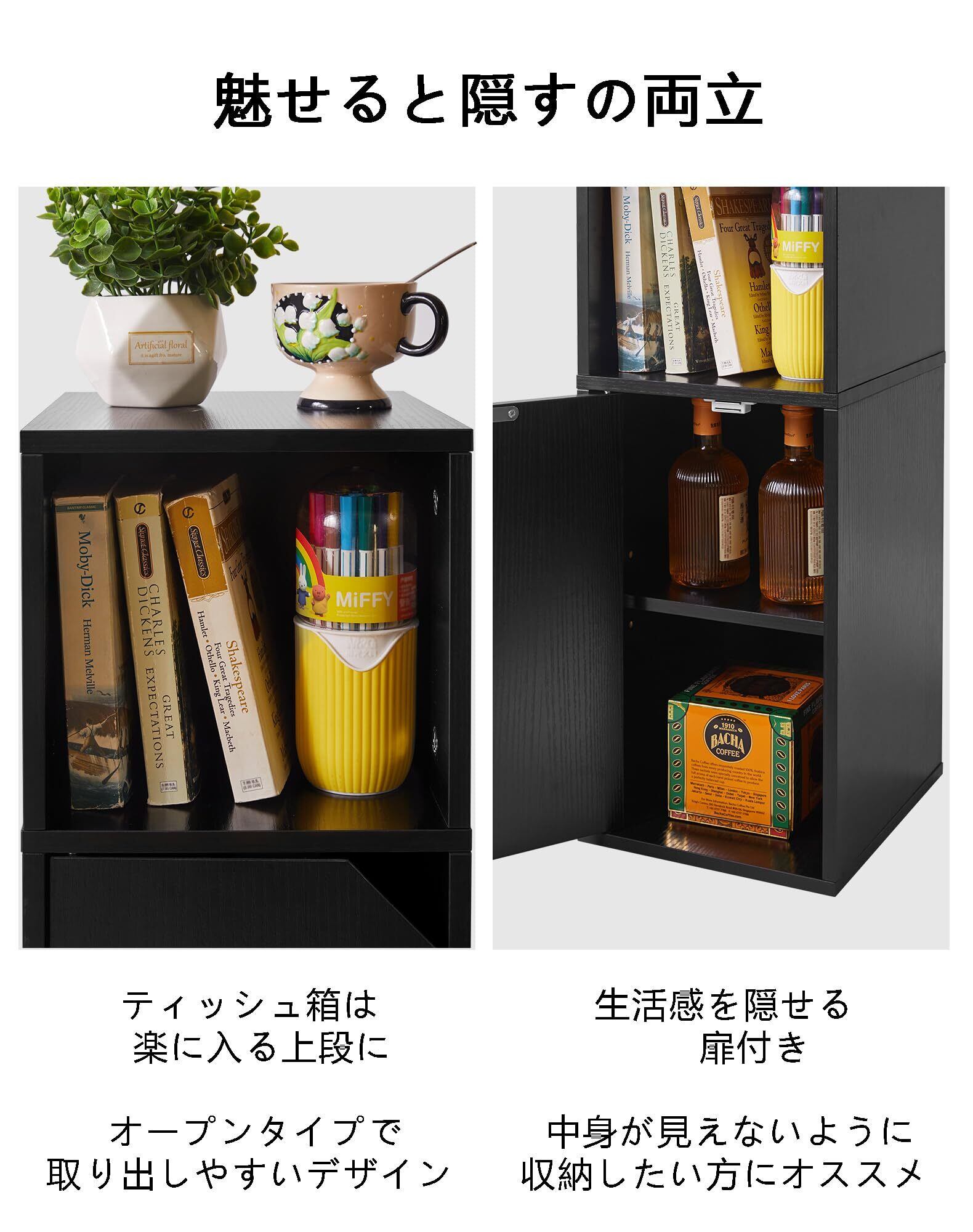 魅せると隠すの両立:上段はラフに文庫文・ティッシュ箱が入れられるオープンな収納スペース。下段は可動棚で、収納したい物に合わせて三段階調節でき、高さのある置物も置けます。さらに扉付きで、生活感を抑えたスッキリ見た目のサイドテーブルとしてお使いいただけます。「見せる」と「隠す」の二種類の収納で、スッキリ片付いた素敵な空間に。