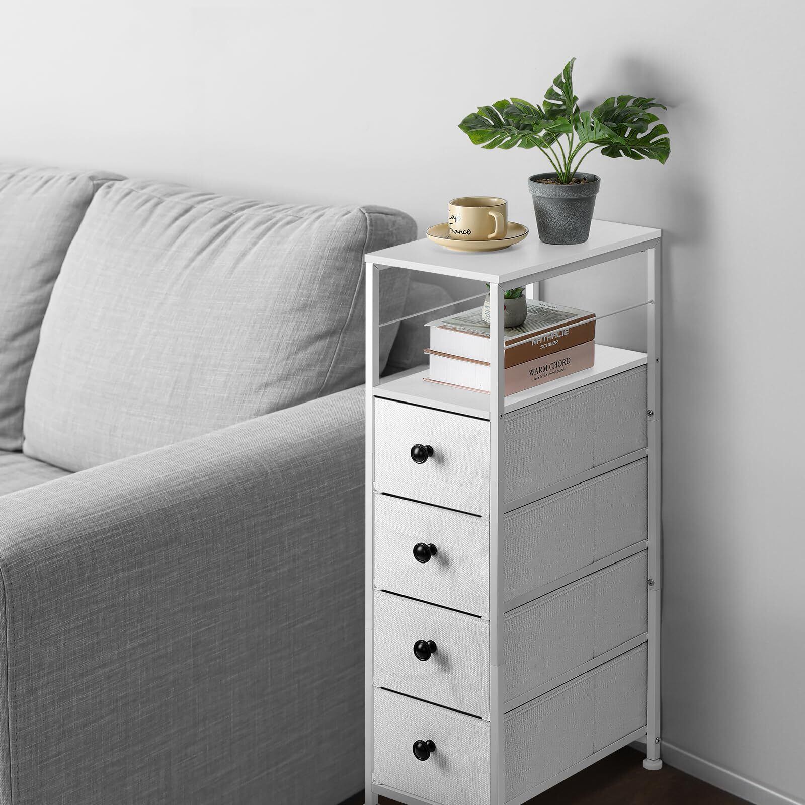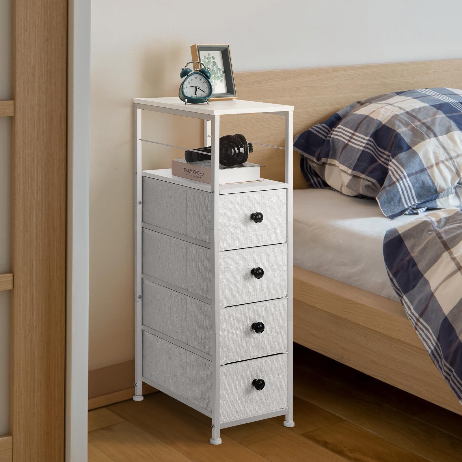 サイドテーブル スリム 白 4つ引き出し付き 寝室 布製引き出し サイドチェスト 木製天板付き ナイトテーブル 北欧 4段 収納チェスト おしゃれ 北欧 電話台 ベッド横 ベッド周り収納 転倒防止 一人暮らし