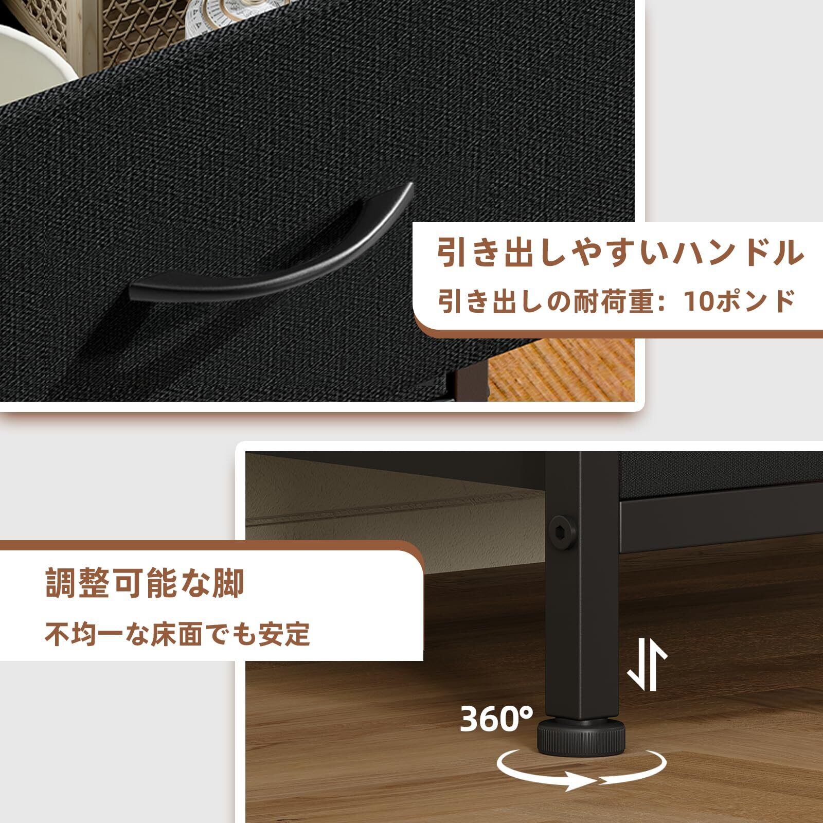 【高品質な素材】2段チェストは上質で頑丈なスチールを採用されるため、長持ちのうえ、安定性・耐摩耗性に優れています。優しい風合いの木目調の天板はよりエレガントで、耐荷重8kgまでで、上に本やコップなどの小物を置けます。ナイトテーブルの脚は調整できるタイプで、平らでない地面にバランスを保つために調整できます。下にも一定のスペースがあって、掃除しやすいです。