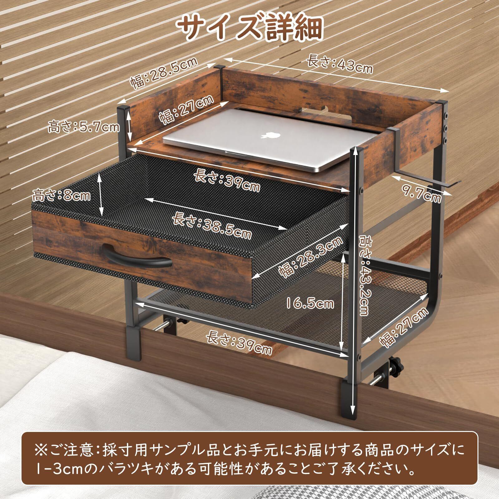 「頑丈な構造で安定性抜群」安定性の高めた頑丈な炭素鋼とMDFボードを使用した堅牢な作りになっております。ゴムパッド付きクランプでベッドフレームにしっかりと固定され、揺れや傾きを防ぎ、長期間の使用にも耐える耐久性を実現してくれてます。更に、シックな木目調でインテリア性も高くなり、リビングや書斎、オフィスなどにしっくり馴染みやすく、お部屋の雰囲気を上品に演出してくれます。