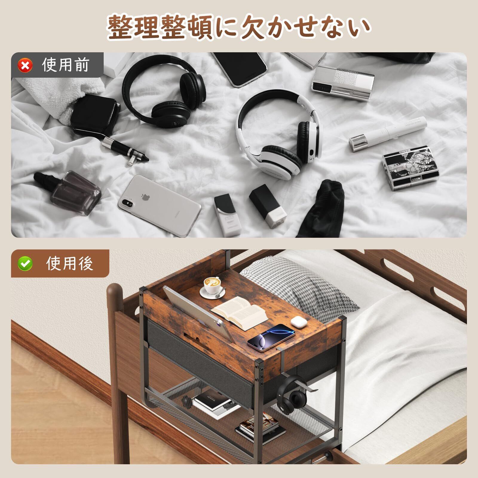 「大容量収納で整理整頓をサポート」多機能な収納スペースで、寝室をスッキリと整理いただけます。上段トレイは本やスナック、水筒などの日常品を、引き出しには貴重品や小物を収納可能で、側面のフックでヘッドホンを掛けるなど、あらゆるアイテムの定位置を確保できるようになっております。滑り止め加工と角の丸み処理で、安全性にも配慮しておりまして、最大25kgまでの耐荷重で、タブレットや書籍など複数の荷物を安心して置いていただけます。