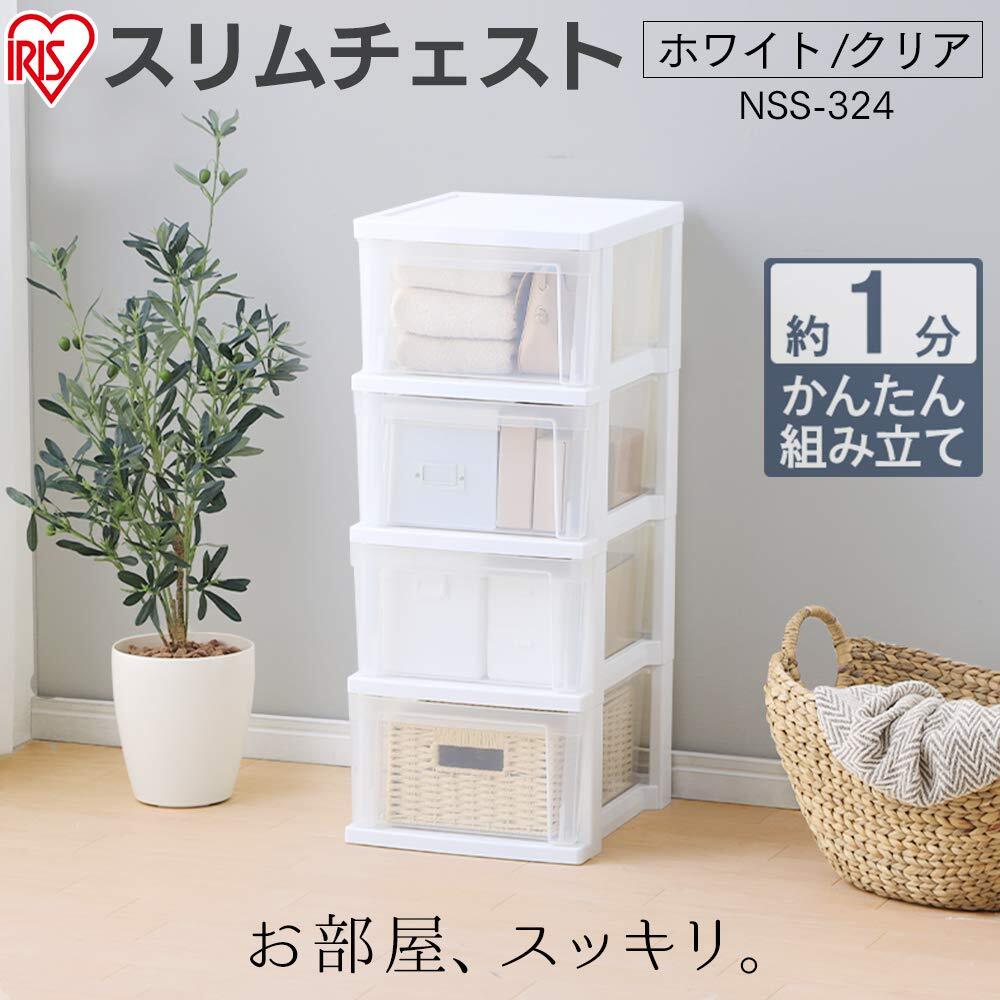 アイリスオーヤマ チェスト スリムチェスト 4段 頑丈設計(一体型フレーム) 水回りOK NSS-324 幅30.9×奥行38×高さ77.8㎝ ホワイト/クリア