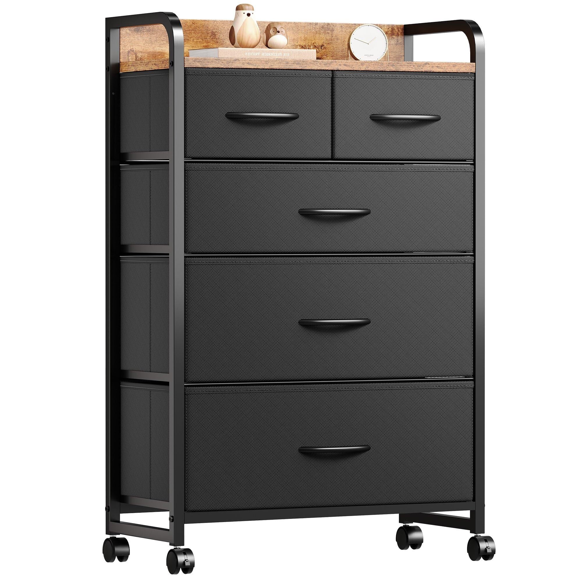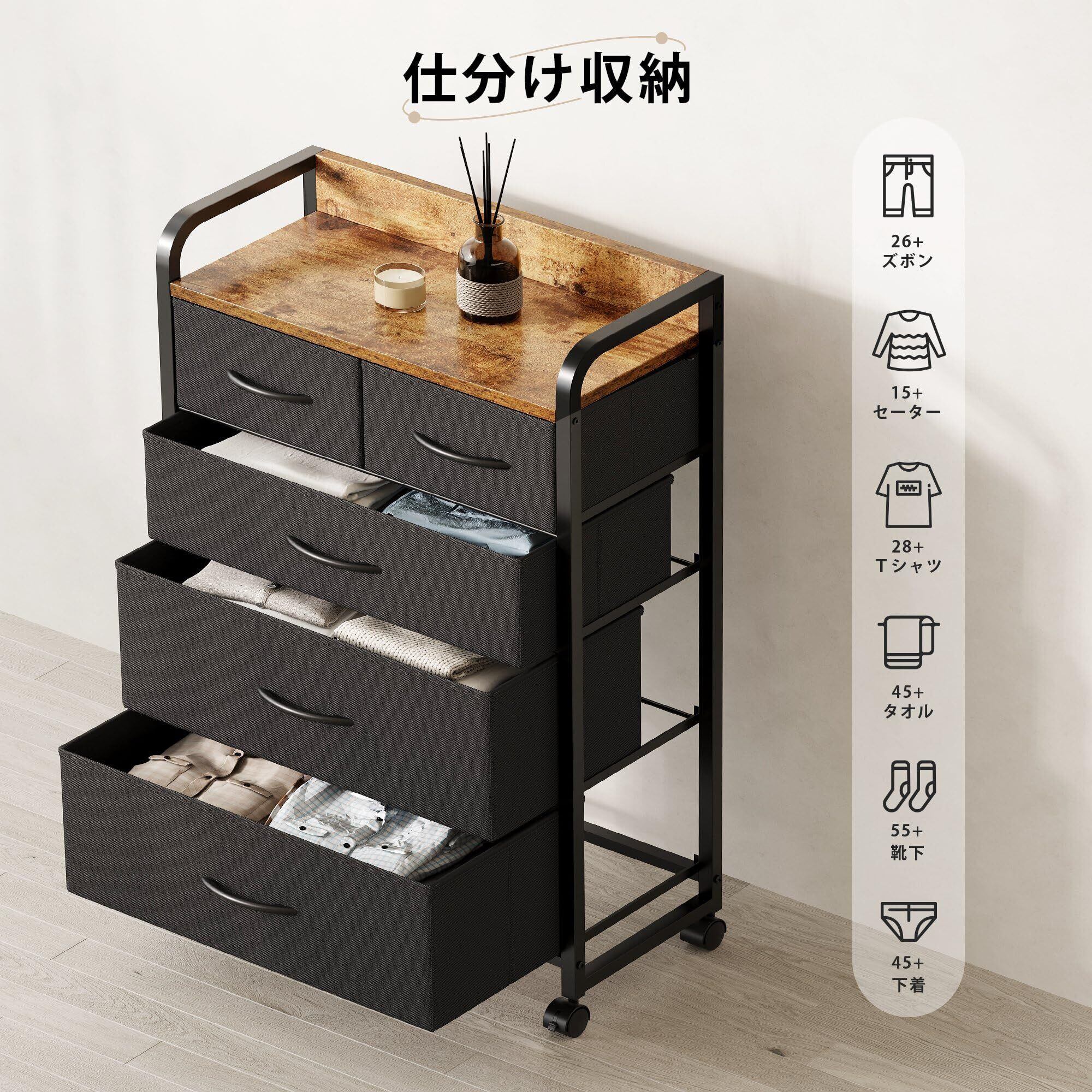 チェスト タンス 箪笥 洋服タンス 洋服収納 4段収納 引き出し 収納 たんす 衣類収納 ファブリックチェスト リビング 収納 木製天板付き 和風 布製引き出し 転倒防止 安定感 ストッパー付きキャスター L55×W29×H97cm (4段5杯 ピンテージ)