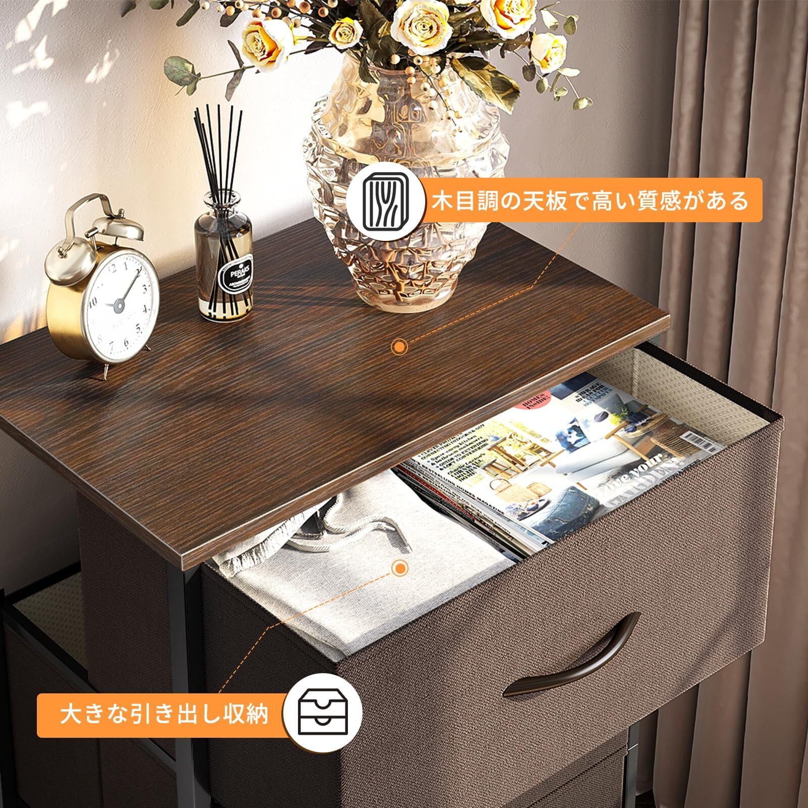 【丈夫で安定】チェストのフレームは上質で頑丈なスチール素材を採用されるため、長持ちのうえ、安定性・耐摩耗性に優れています。しっかりとした構造なので、安定してぐらつきません。通気性がよく丈夫な不織布製の引き出しにはハンドルが付きで、スムーズに開け閉めできます!それに質感がよい木目調の天板はエレガントで、柔らかい雰囲気を!