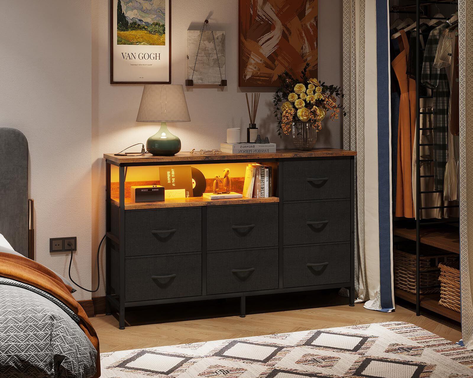 \【◆AODK タンス チェスト コンセント&LEDライト付き 幅132×奥行30×高さ90cm テレビ台 リビング 収納 大容量 洋服タンス 収納ケース 衣装ケース 布製引き出し 箪笥 おしゃれ 転倒防止 安定感 3段7杯 ブラック&ビンテージ】】機能とデザインが融合した収納アイテムの決定版です!/