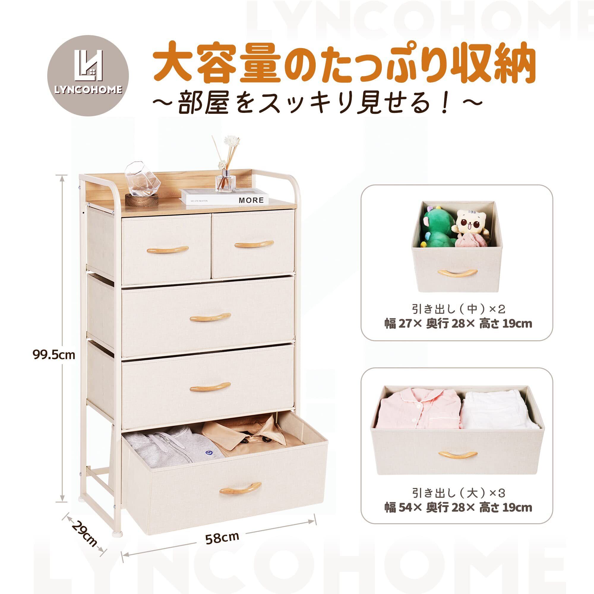 LYNCOHOME チェスト タンス 収納ボックス ベージュ 布製 引き出し 一人暮らし おもちゃ 衣類収納 マルチ収納 転倒防止 低ホルム スリム 4段5杯【幅58×奥行29×高さ99.5cm】