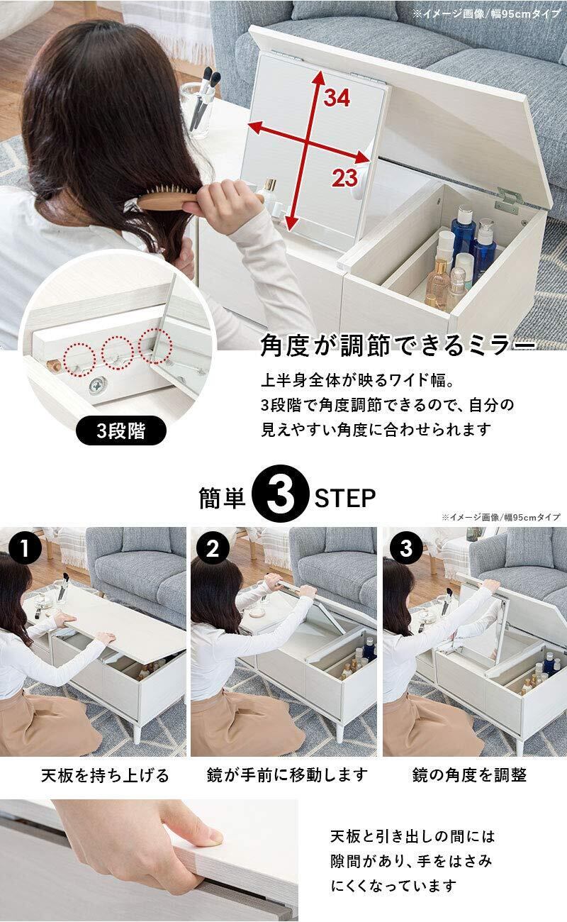 【角度が調節できるミラー】3段階で角度調節できるミラーを採用。上半身全体が映るワイドな幅なので、フェイスメイクからヘアセットまでをカバーできます。