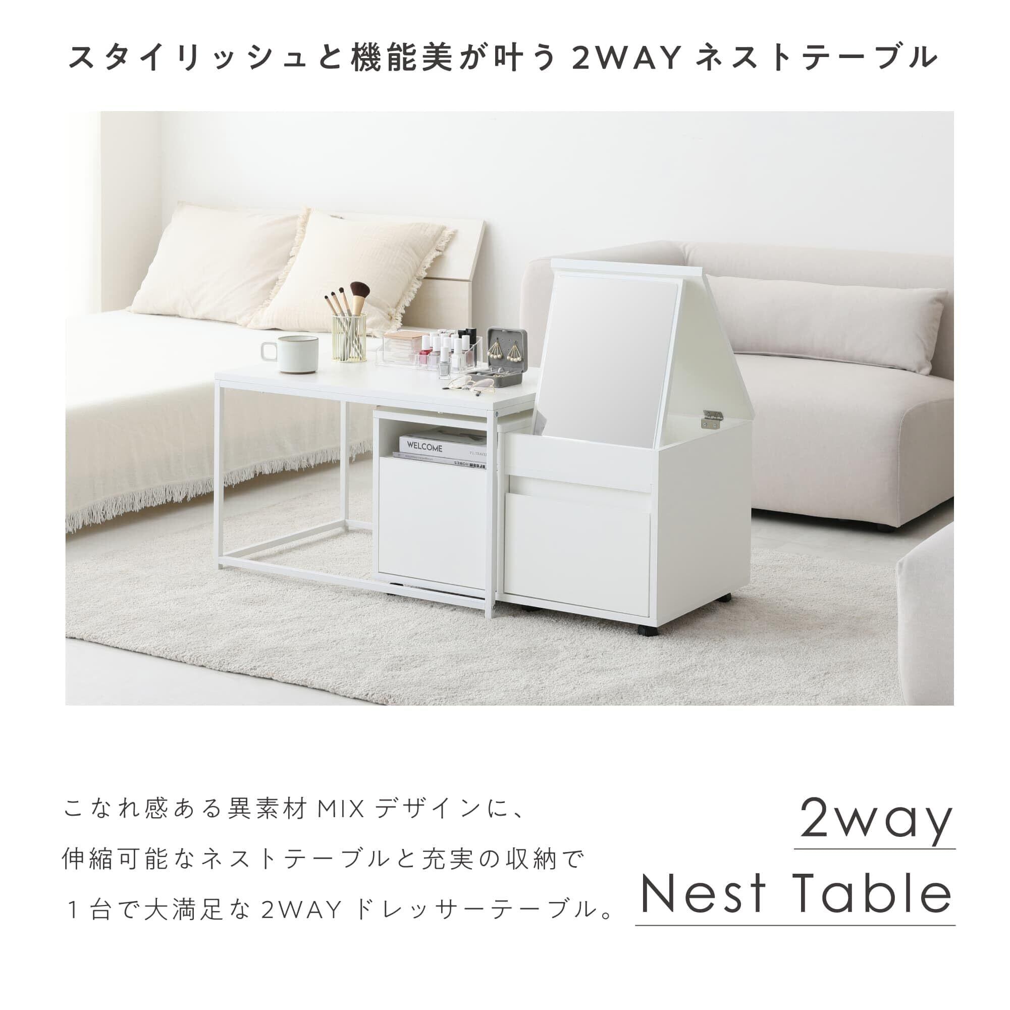 【多機能で省スペース】 ネストテーブル「Toruco-F」は、一人暮らしやコンパクトな空間に最適な多機能ドレッサーテーブルです。センターテーブルとドレッサーテーブルの2WAY仕様により、限られたスペースを有効活用できます。天板を開けると大きな鏡が現れ、ドレッサーとしても使用可能です。異素材を組み合わせたデザインは、上品で洗練された印象を与え、どんなインテリアにも調和します。ナチュラルとホワイトの2色展開で、お部屋の雰囲気に合わせて選べるのも嬉しいポイントです。