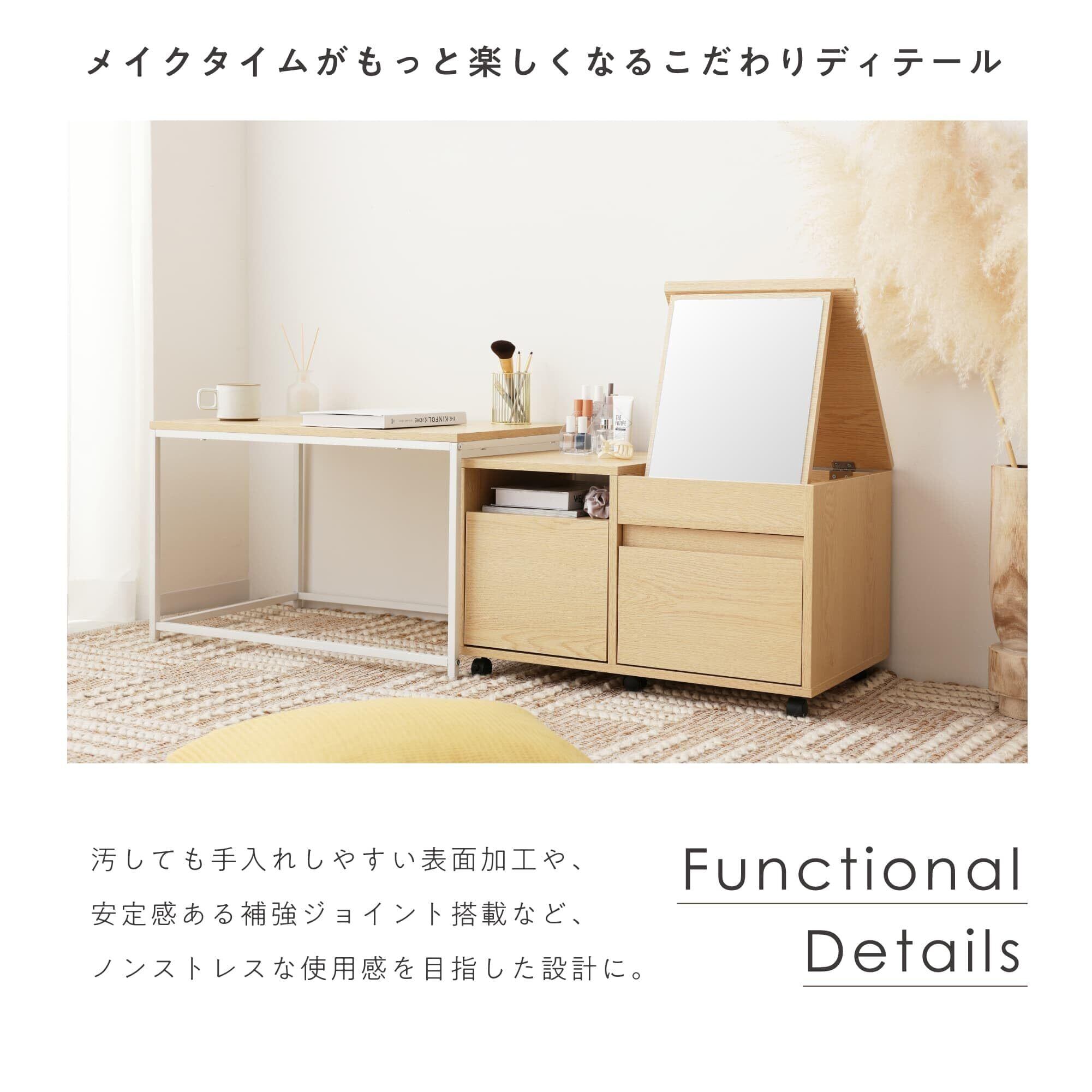 【充実した収納機能】 収納力も抜群で、3つの引き出しとオープン収納があり、用途に応じてスッキリと整理整頓が可能です。天板を開けるとドレッサーに早変わりし、顔全体がしっかり映る大きな鏡が現れます。引き出しは快適なスライドレールを採用し、サッと引き出せる仕様です。角を丸めた安心設計で、安全性にも配慮しました。収納物が見えるオープン収納も備え、使い勝手の良さを実感できます。