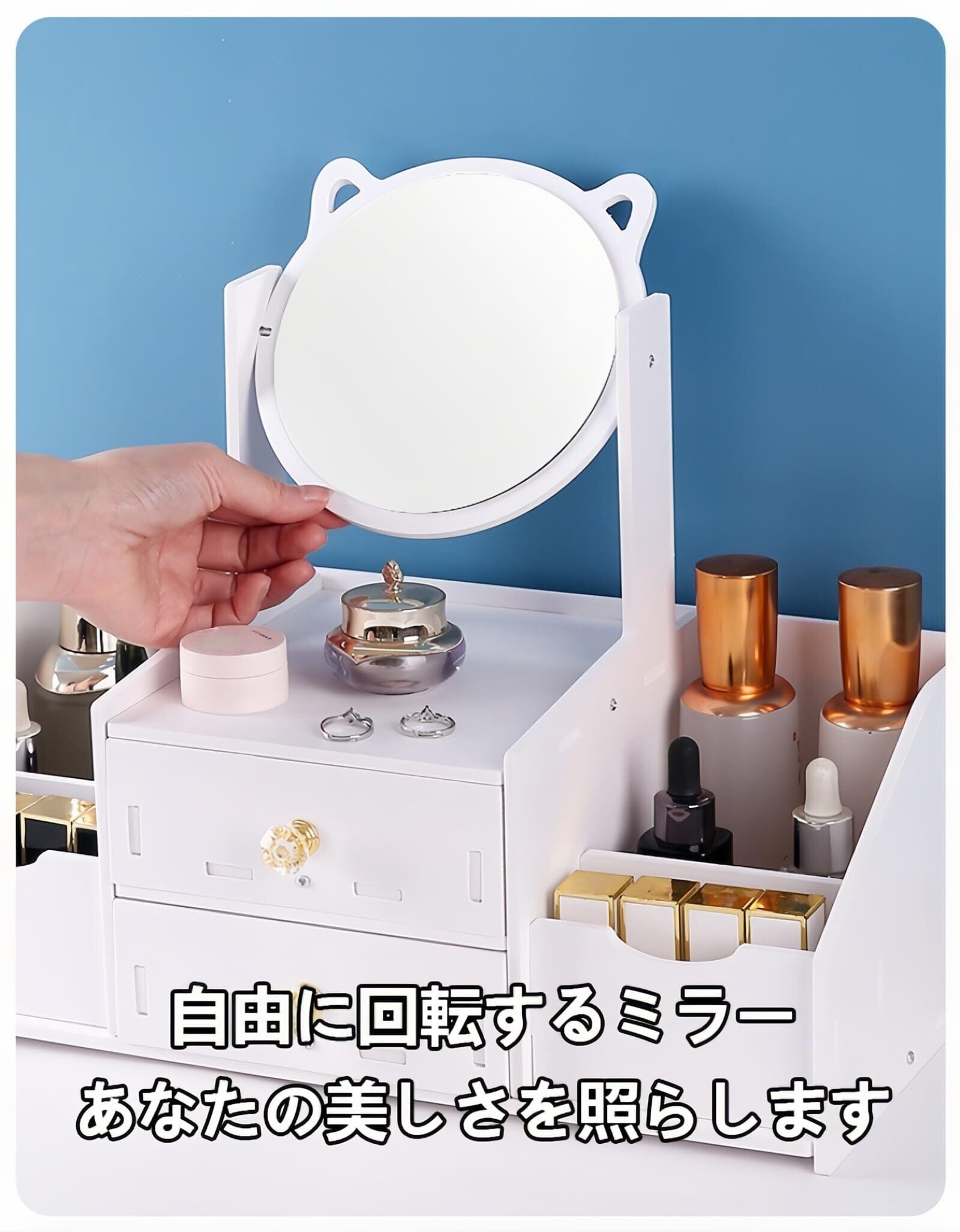 [回転化粧鏡] センター上部には角度調整可能なミラーを完備。その下にはイヤリングや指輪などのアクセサリーが置けるようになっています。下部には引き出しが2段もあるため、パフやメイクスポンジなど埃を避けたいアイテムの収納にピッタリです。