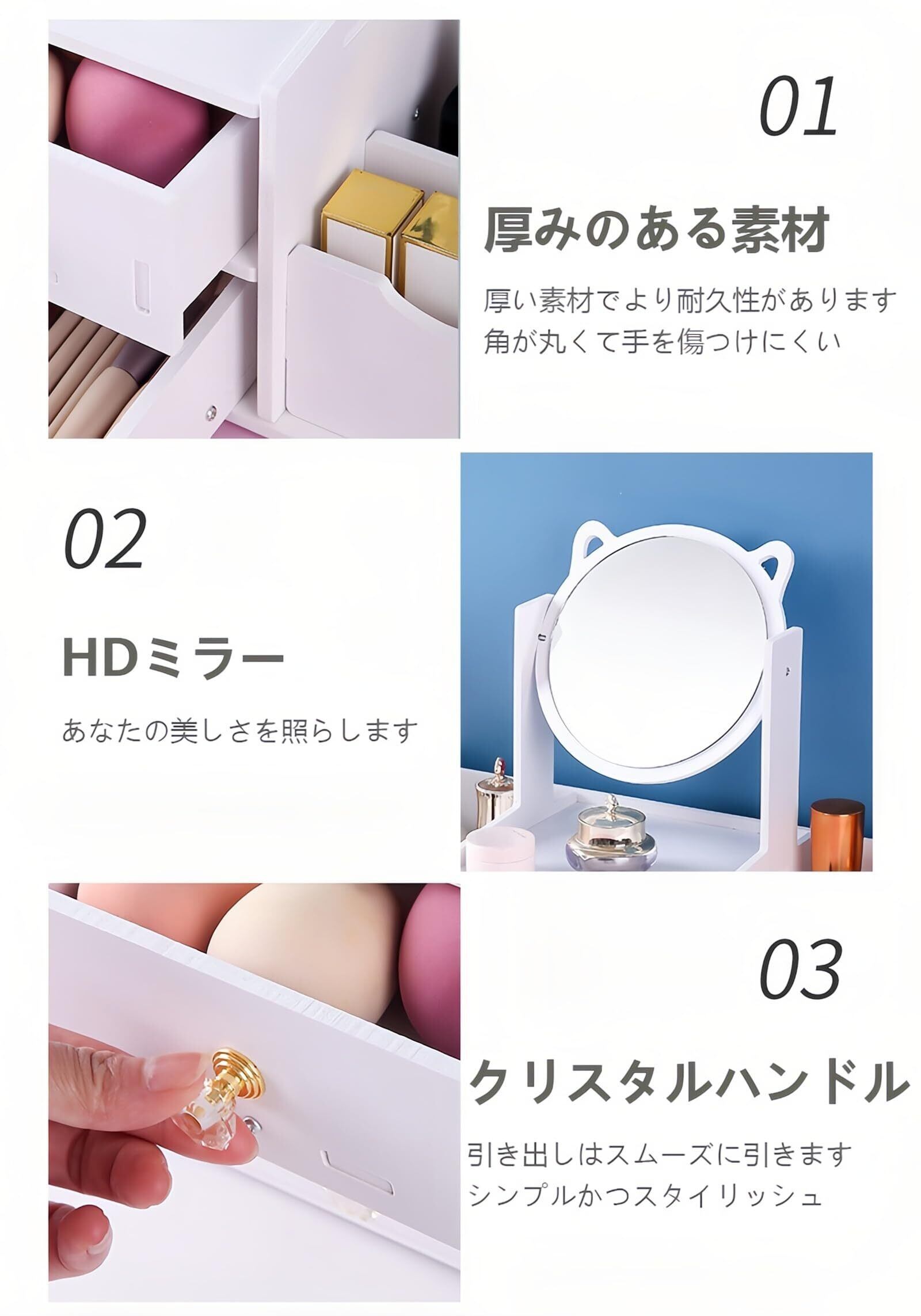 [ミニサイズの可愛いドレッサー] 化粧道具や小物入れに使える可愛いミニドレッサーです。シンプルなホワイトカラーで、猫耳や四角デザインのミラーで化粧をお楽しみいただけます。