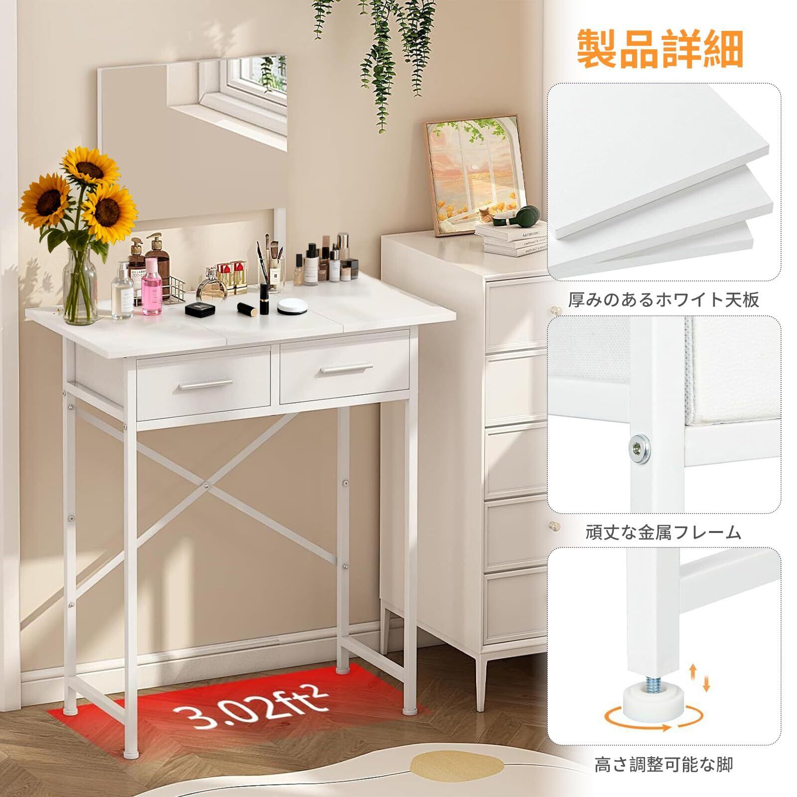 厚みのあるホワイト天板:丈夫で耐久性に優れ、化粧品や小物類をたくさん置いてもしっかりと支えます。清潔感のあるホワイトカラーで、明るく爽やかな雰囲気を演出します。毎日のメイクタイムをより快適にし、お部屋の雰囲気を高めてくれること間違いありません。寝室だけでなく、パウダールームなどにもぴったりです。