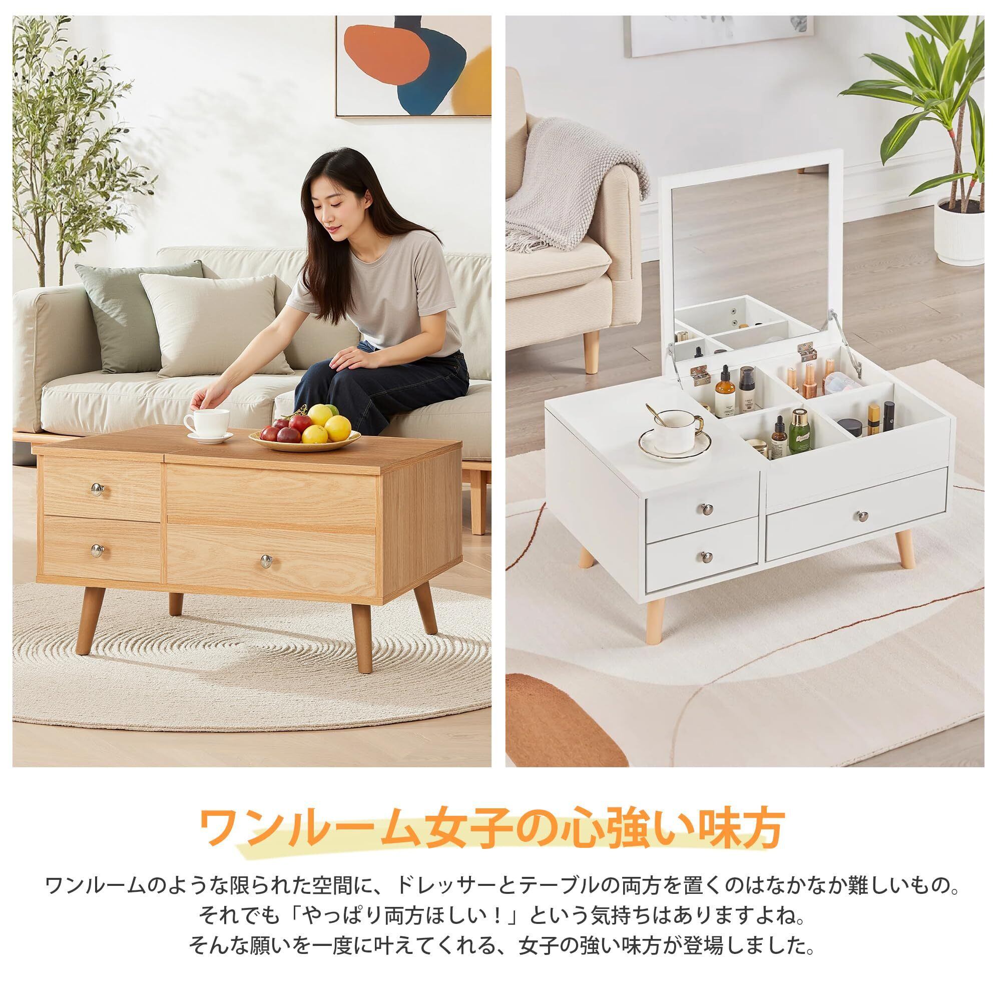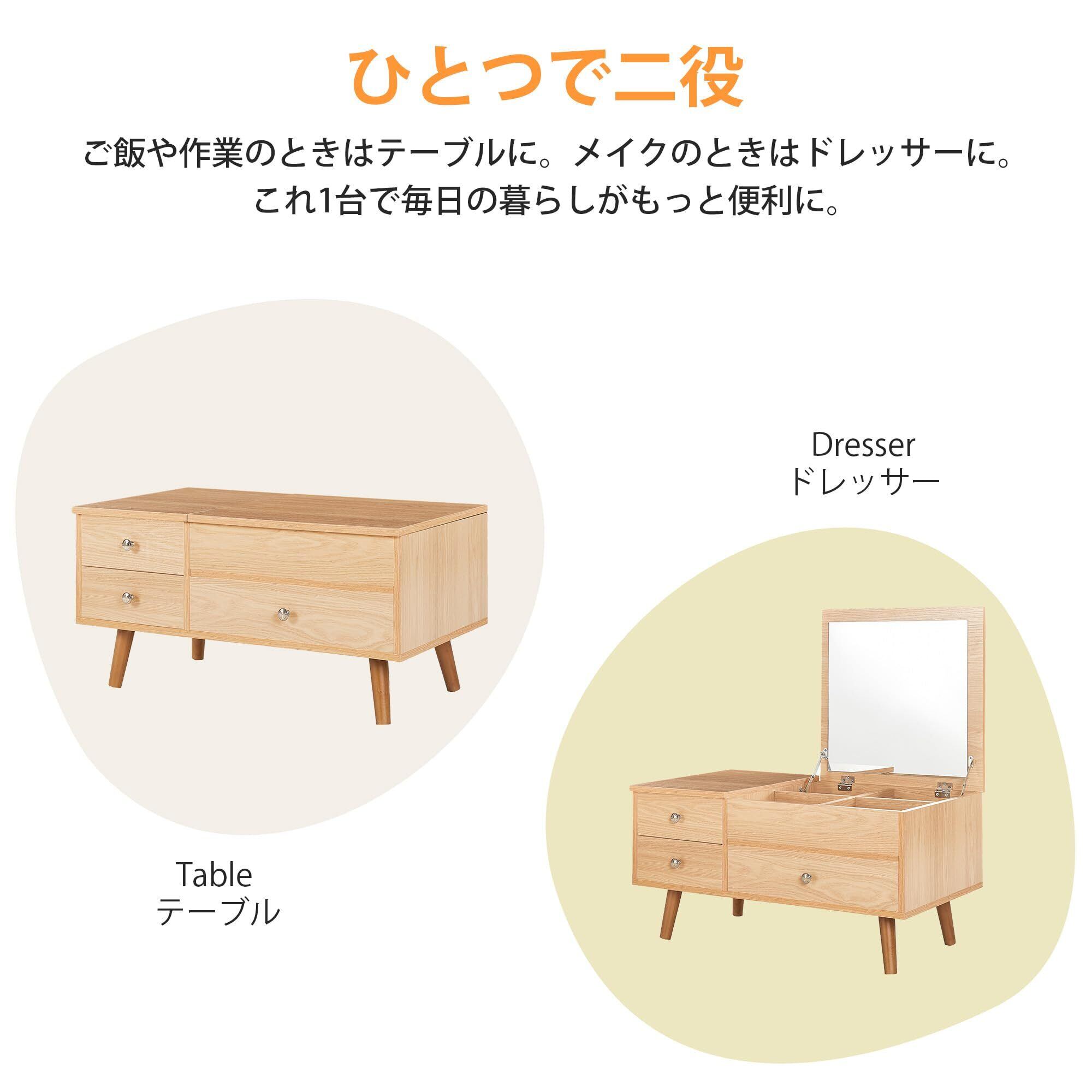 【多機能デザイ】ドレッサーとしてはもちろん、ローテーブルやリビングテーブルとしても使用可能。シーンに合わせて使い分けられる便利な多用途設計です。
