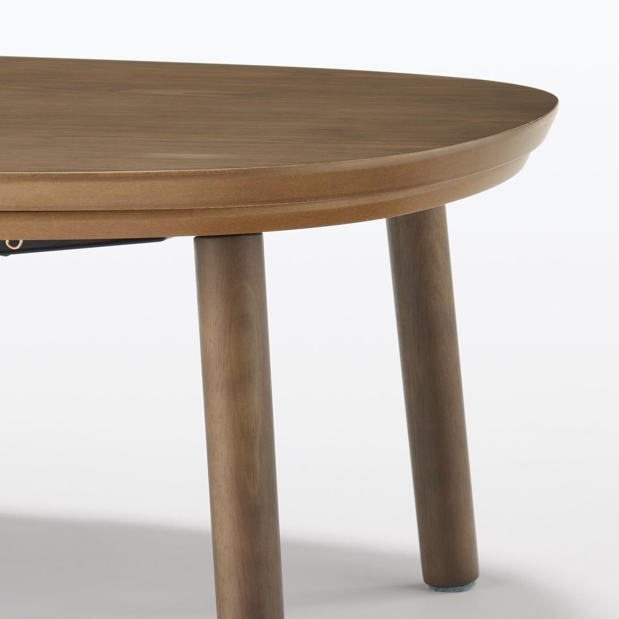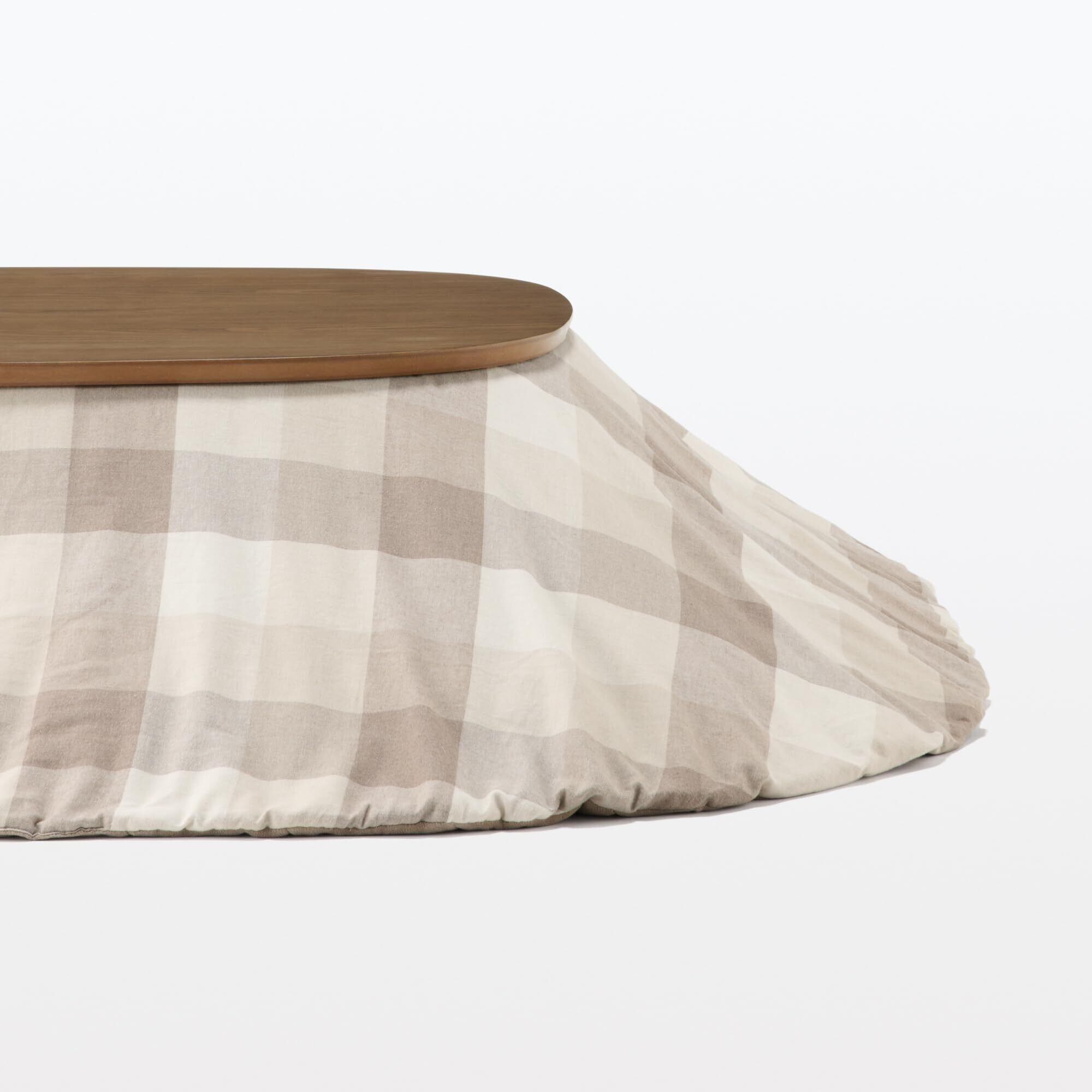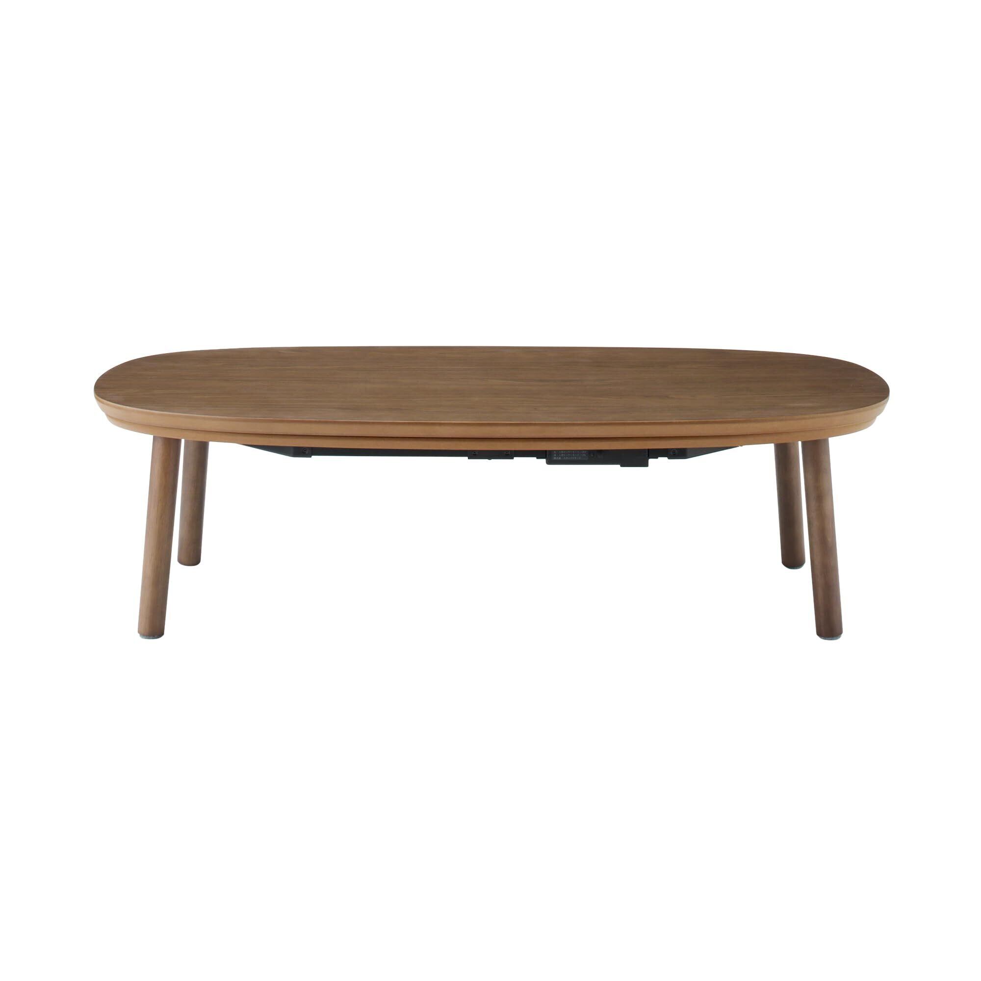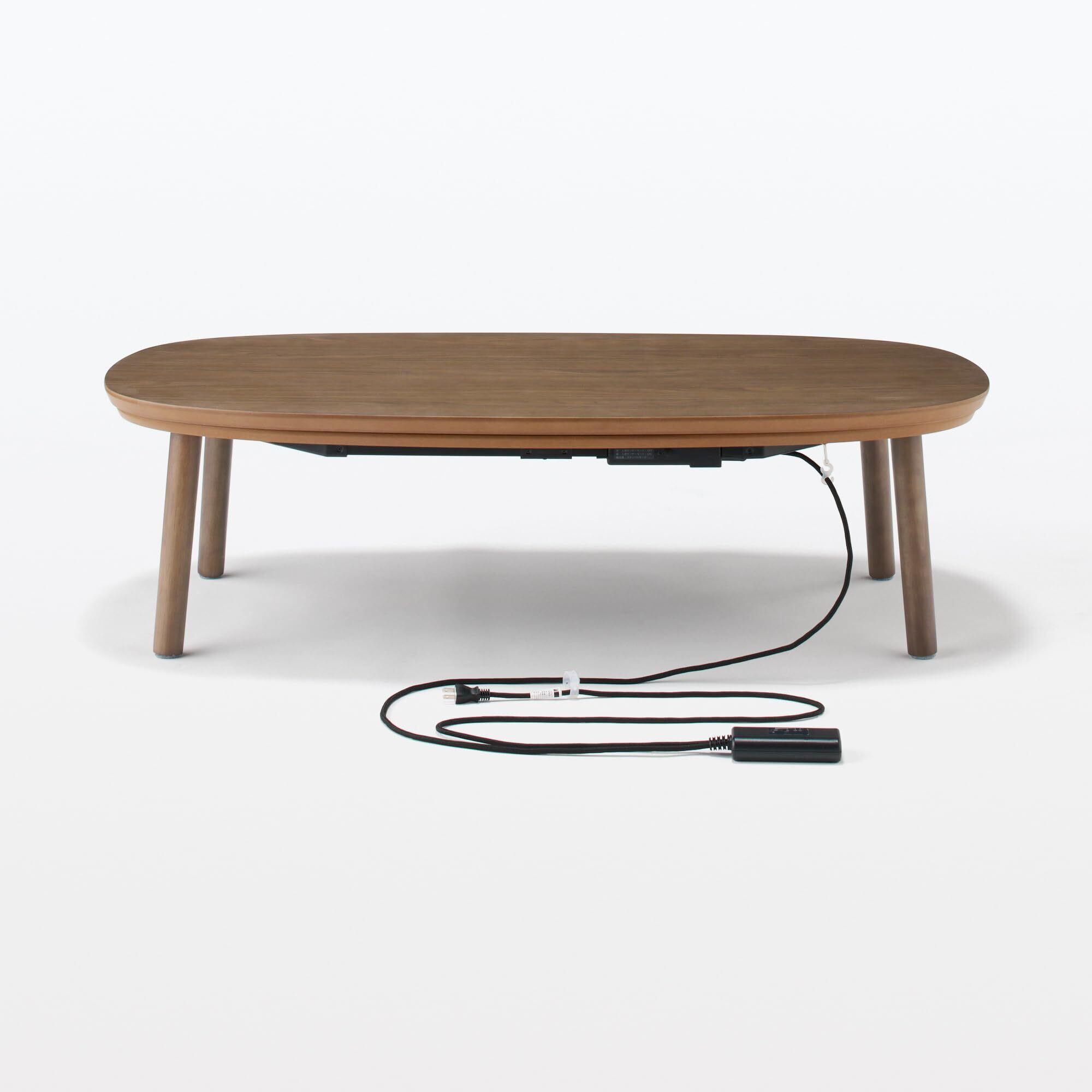 楕円型のこたつは、無印良品の定番商品であり、斜めからでも入りやすく、座る場所を選ばないのが特徴です。