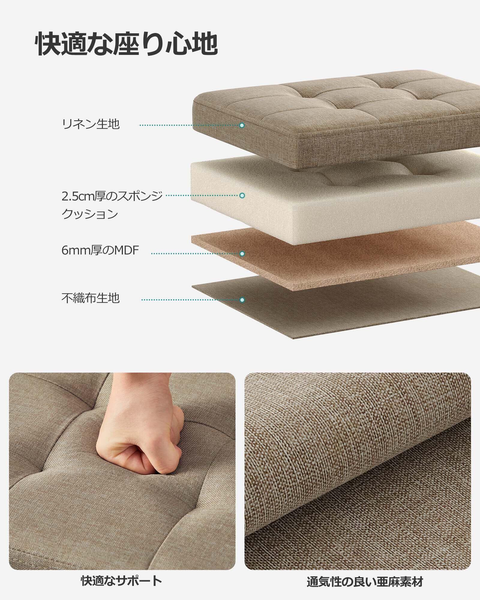 【快適な座り心地】座面には2.5CM厚のスポンジクッションと通気性の良い亜麻素材を使用しており、柔らかく快適な座り心地を提供します。くつろぎの休憩や一時的な座席として使用する際も、快適な感触をお楽しみいただけます。