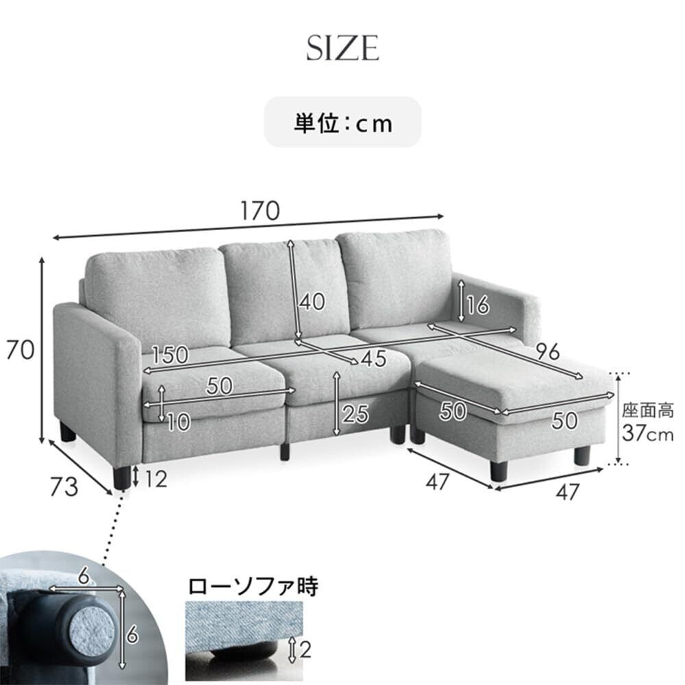 【サイズ】[2P+1P] 外寸:幅170×奥行73×高さ74cm [オットマン] 幅50×奥行50×高さ40cm [脚の直径] 約4cm[脚のネジ規格] M8×30(直径8mm×長さ30mm)【重量】約47kg (左肘パーツ:約15kg、真ん中パーツ:約11kg、右肘パーツ:約15kg、スツール:約6kg)【耐荷重】約200kg