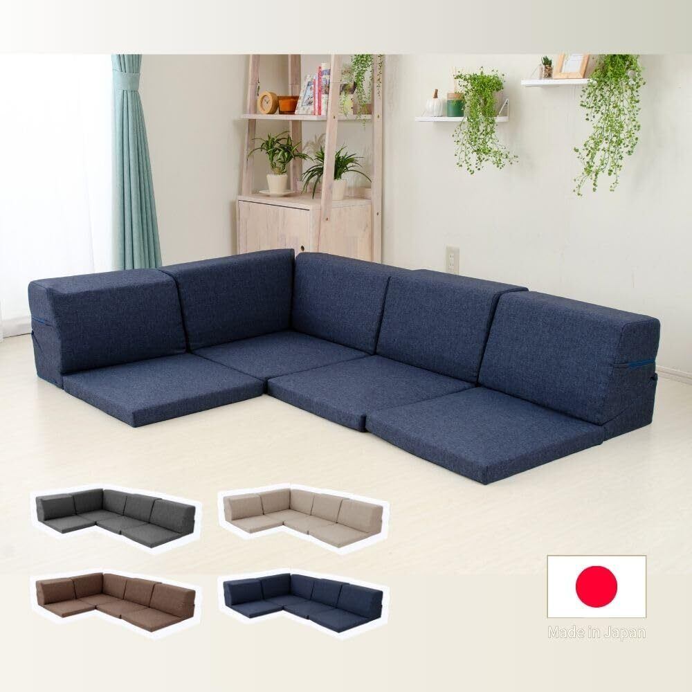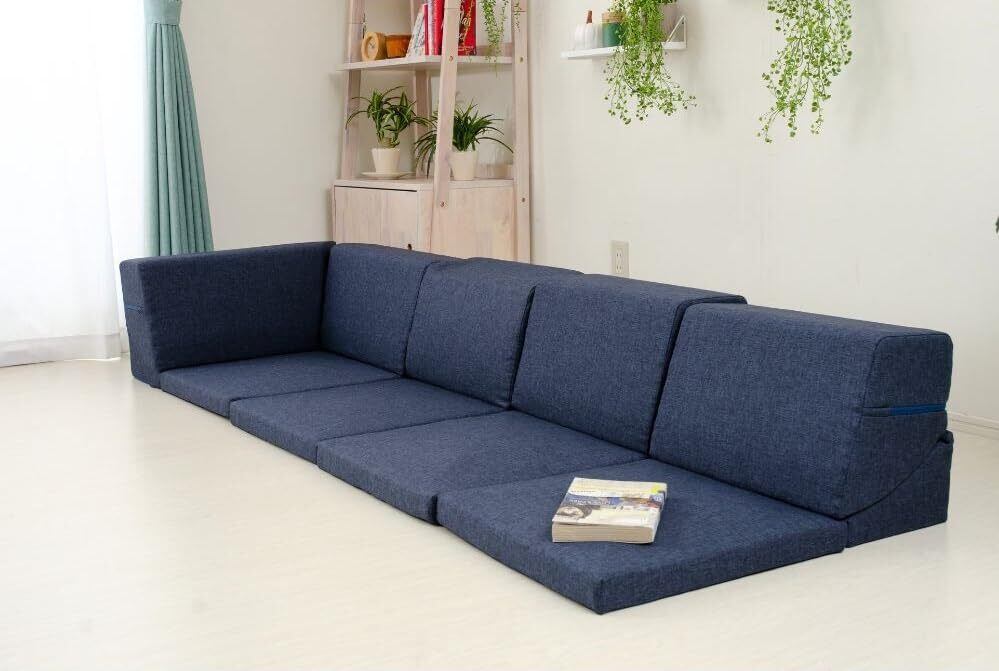 4つのパーツに分かれており、自由なレイアウトが可能です。コーナーソファも背もたれが倒れる仕様で使い方の幅も広がります。シンプルなデザインは和室・洋室どちらにも馴染み、ノンフレーム&軽量設計で掃除や模様替えもラクラクです。