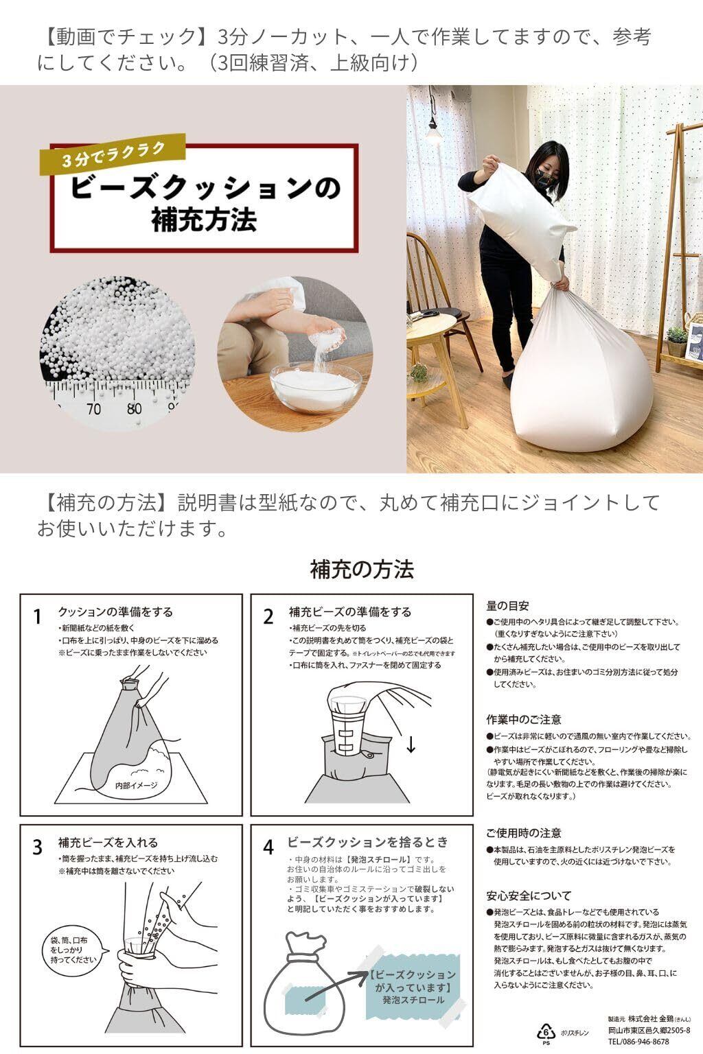 取扱い方法/ご使用のビーズクッション、ビーズソファに補充してお使いいただけます。出荷形態/補充しやすい形状の不織布に入れています。取り扱い説明書付き。