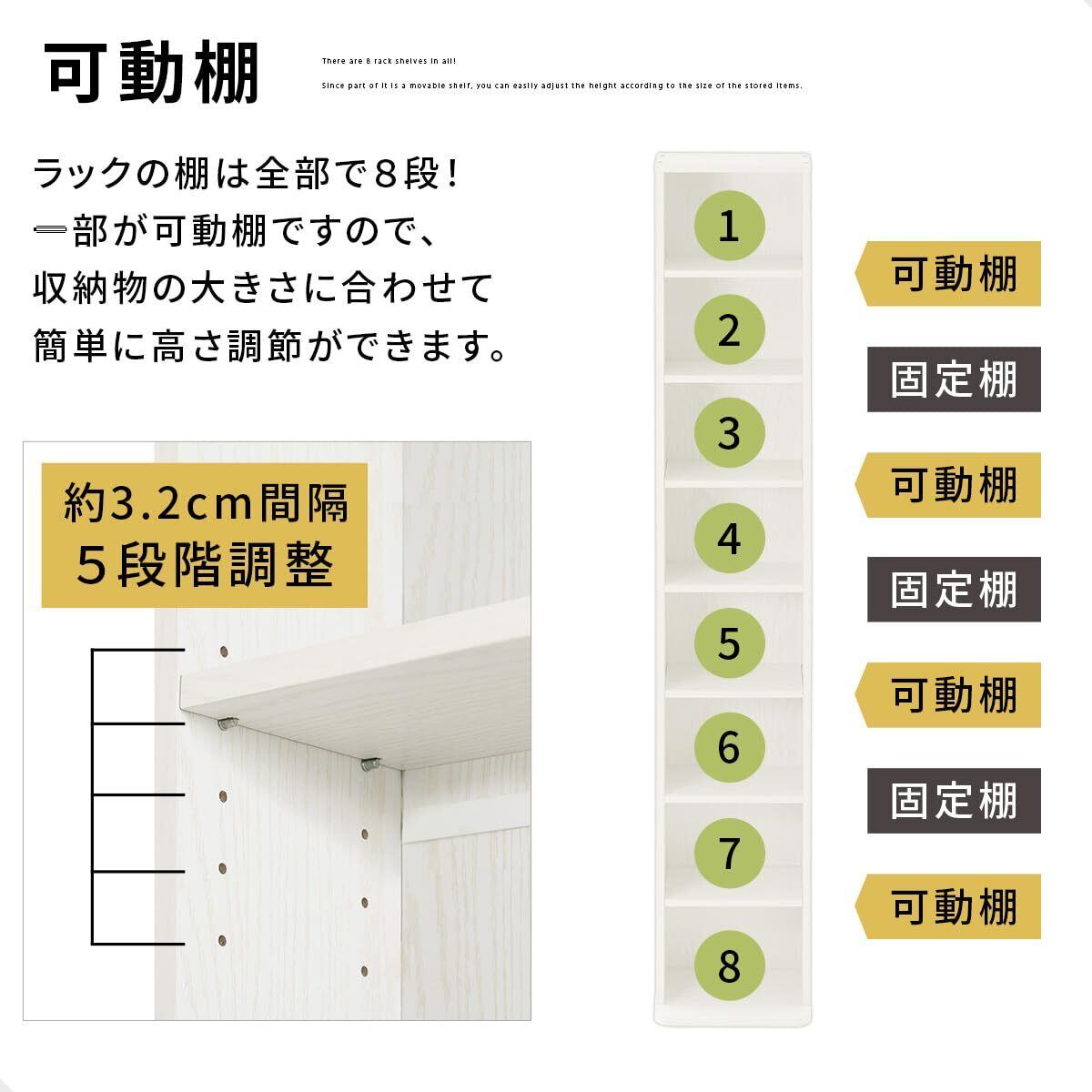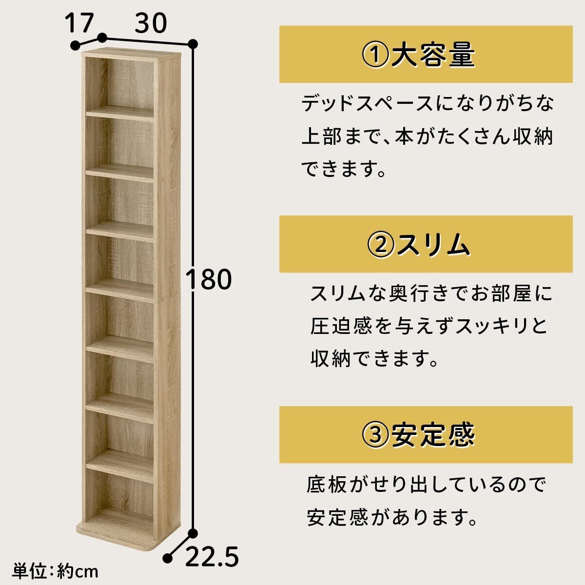 ぼん家具 本棚 スリム 大容量 収納棚 幅30×奥行22.6×高さ179.9cm 8段 収納 コミックラック 可動棚 ホワイト