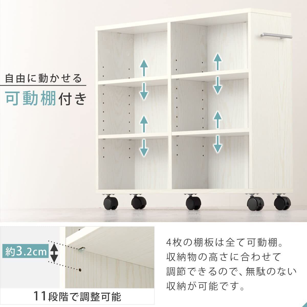 可動棚:4枚 / 耐荷重 各棚板:約8kg 天板:約15kg 全体:約30kg / キャスター付き / 背面化粧:有り / 必要工具:プラスドライバー、ゴムハンマー ※上記工具は付属しませんので別途ご用意ください。