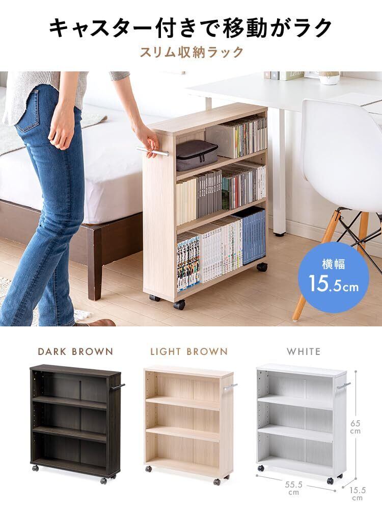 イーサプライ 本棚 キャスター付き スリム すきま収納 3段 幅15.5cm 奥行58.5cm 高さ65cm 木製 ラック DVD マンガ ライトブラウン EEX-EG08LBR