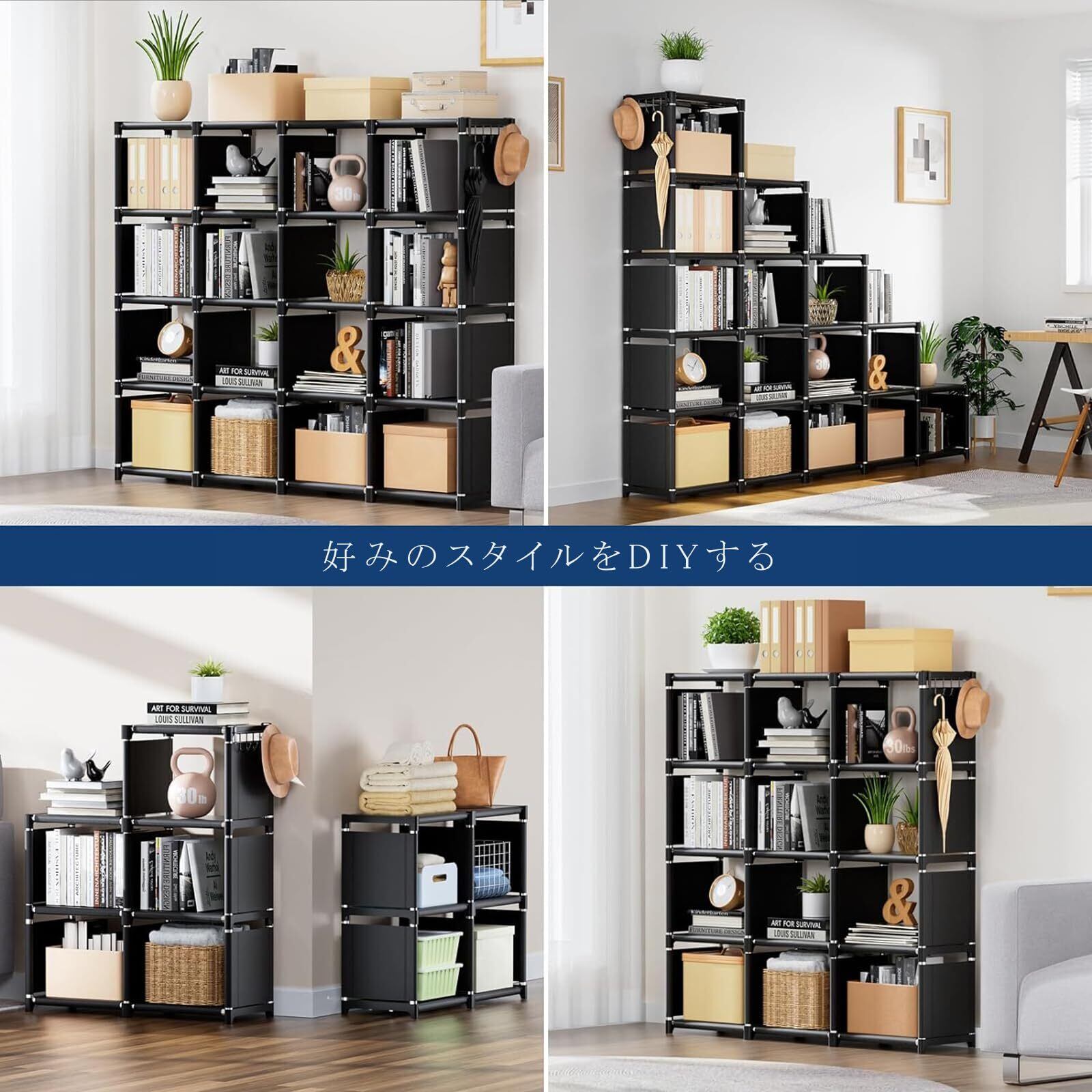 【自由にDIY】:自由に想像力を働かせてください。組み立て棚の立方体の構造は、本棚、ラック、クローゼットの収納棚など、さまざまな形を作ることができます。