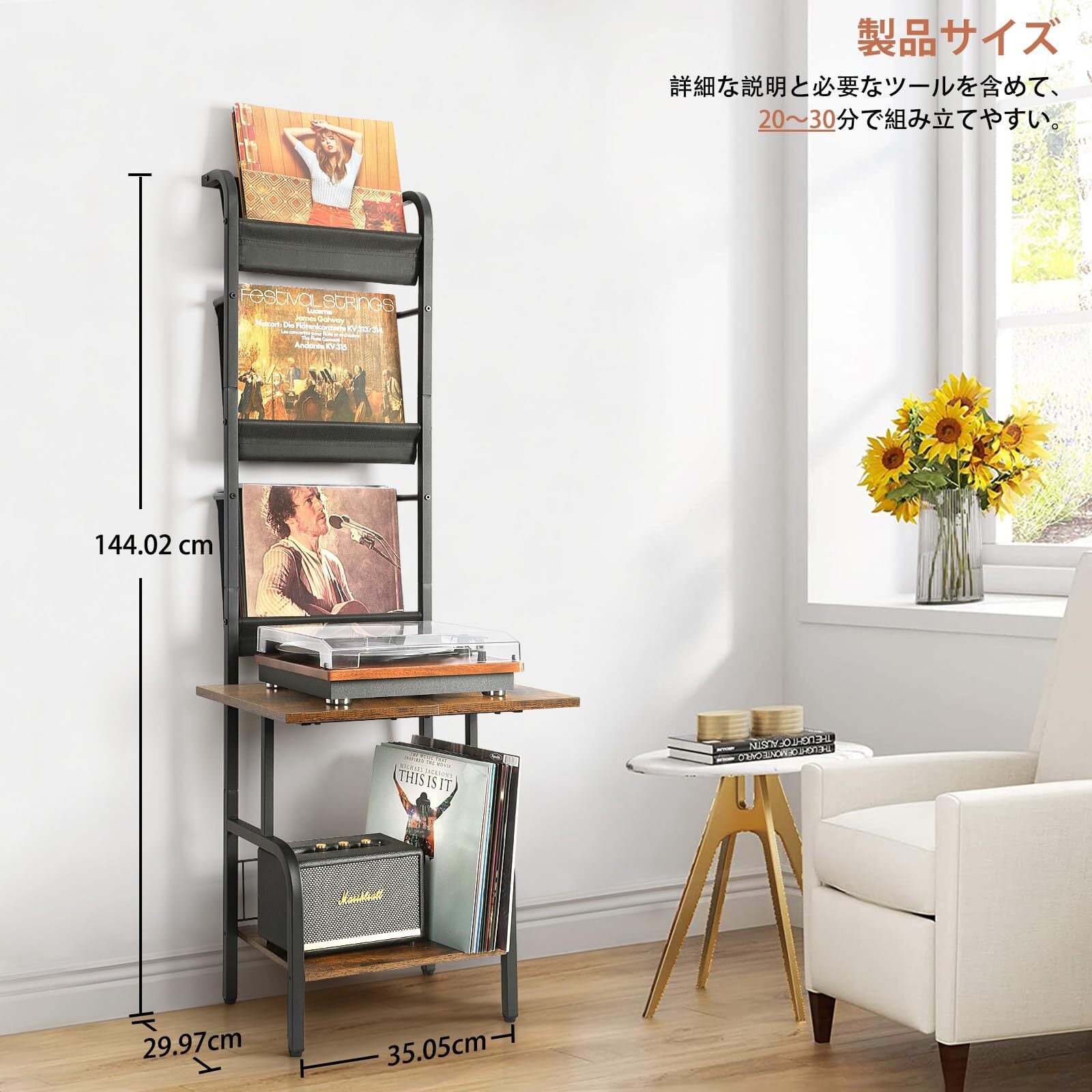 【垂直設計、しゃがむ必要なし】全体サイズ:35.05 cm(長さ)× 29.97 cm(幅)× 144.02 cm(高さ)。垂直スペースを利用することで、床面積を効果的に削減できるだけでなく、レコードをかがまずに取り出すのがさらに便利になります。