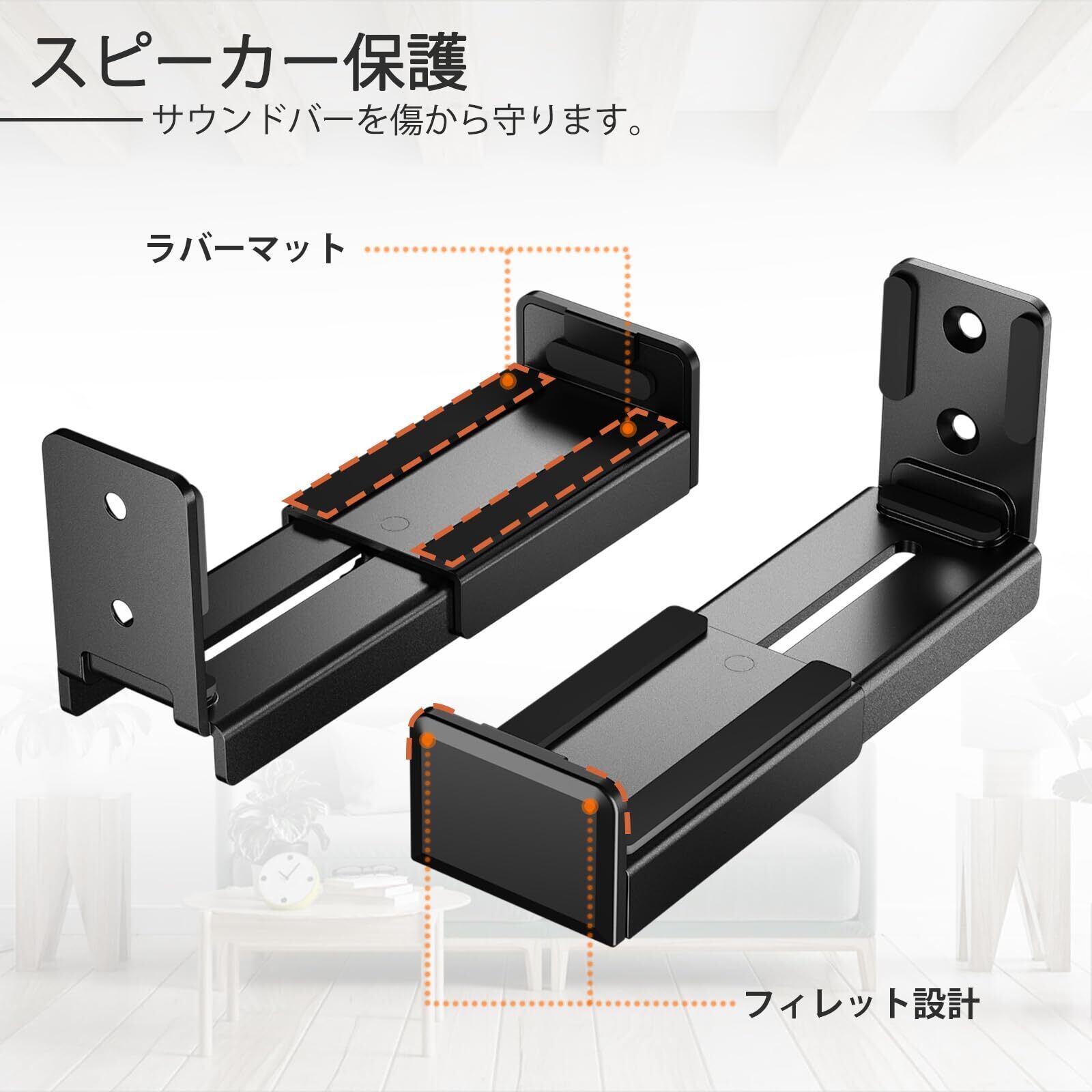 【高い汎用性】高品質のスチール製で、耐荷重15kgまで、大切なサウンドバーを完璧にサポートします。柔軟な滑り止めEVAパッドは、使用中のオーディオによる振動を排除しながら、スピーカーをスクラッチから保護します。