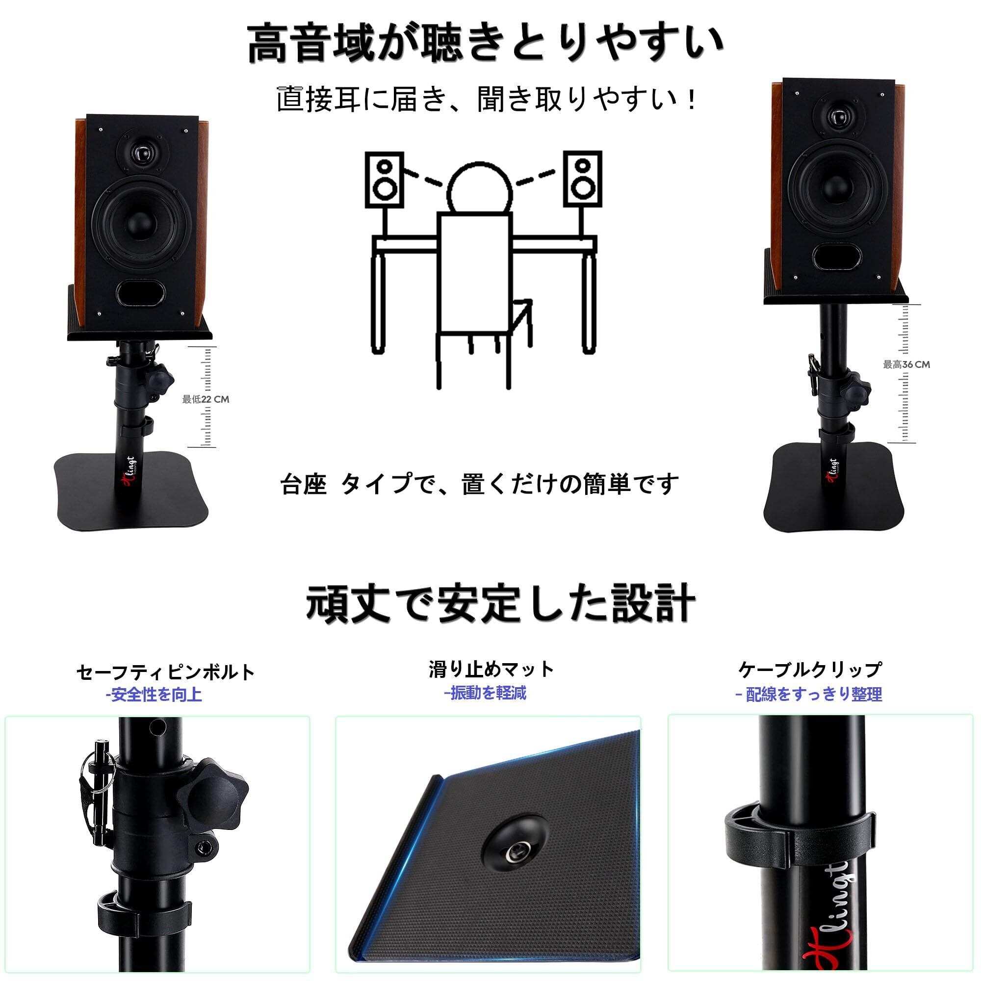 クリアな音質と傾斜トレイ設計:スピーカーを耳の高さに合わせて設置でき、ピンボルトでスタンドを4段階(22cm、28cm、32cm、36cm)の高さに調節可能です。これにより、あらゆる周波数を捉え、クリアで臨場感のある音を実現します。また、トレイは+10°から-10°まで傾斜を調整でき、音を耳の高さにしっかりと向けることができます