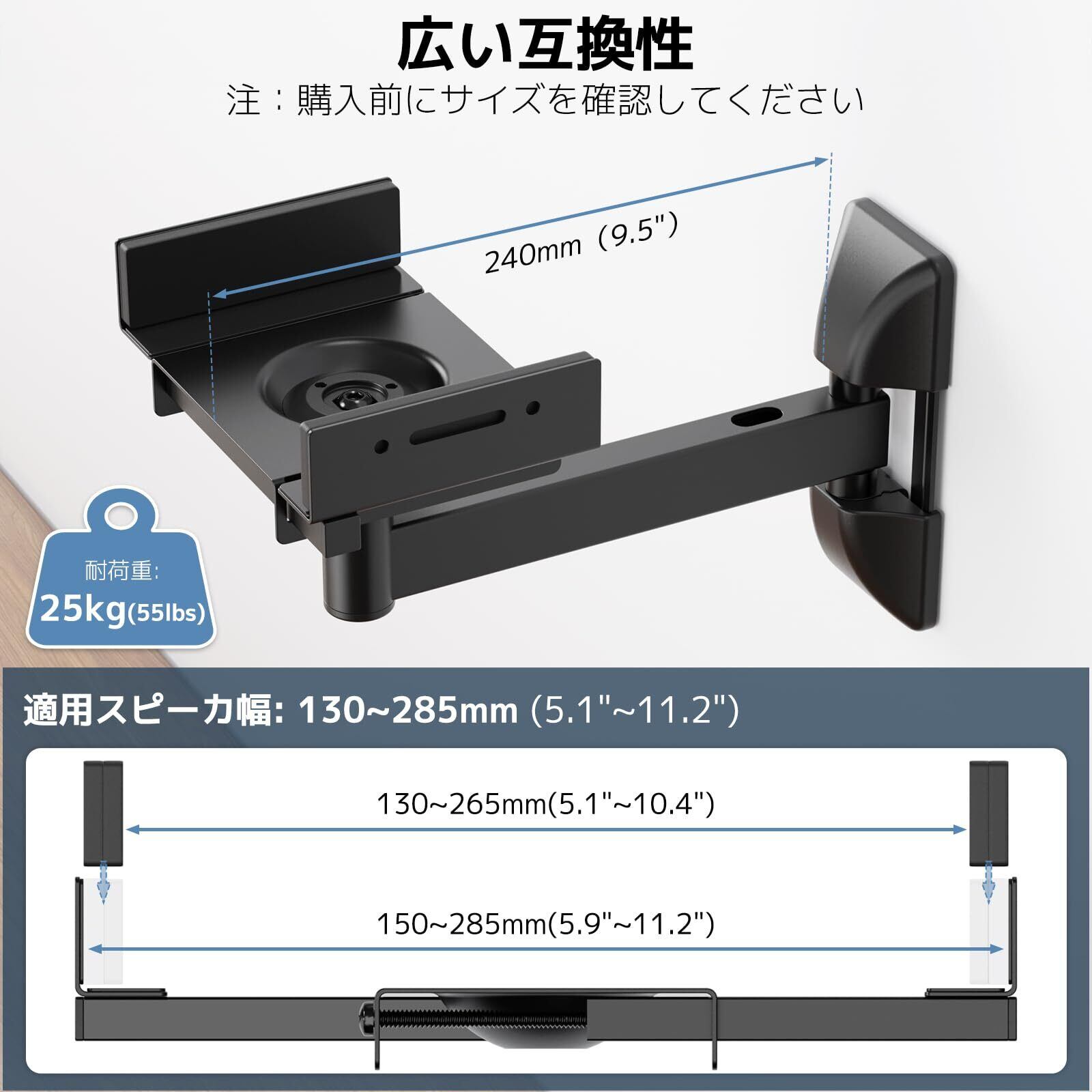 大型スピーカー 壁掛け金具 耐荷重各25kg スチール製 スピーカ壁掛けブラケット 幅130-285mm 10°上下/左右傾斜/ 360°回転/アームは左右に45°回転 2個セット
