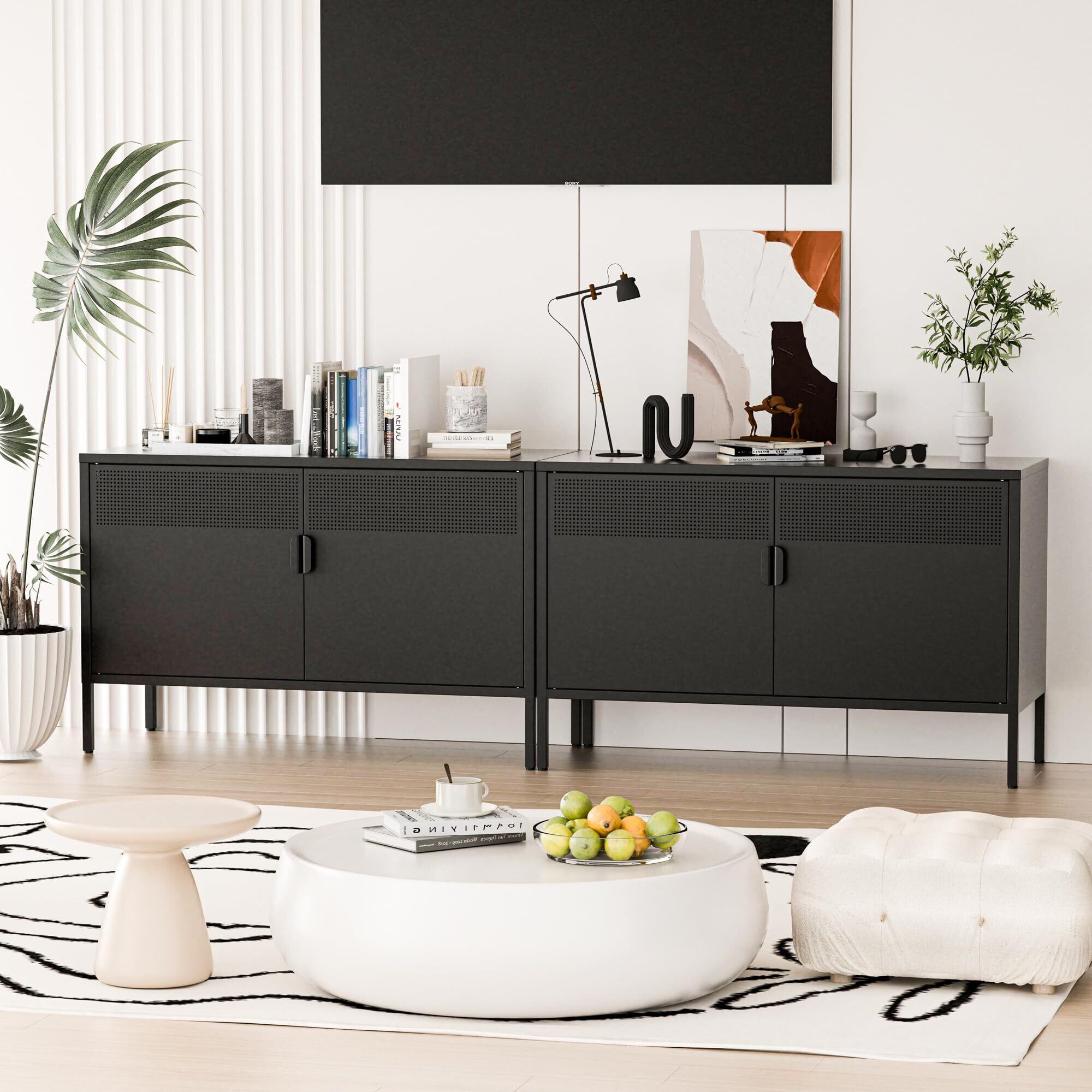 キャビネット 鋼製 サイドボード 扉付き リビング 収納 棚 観音開き 調節可能な棚付き 通気孔付き おしゃれ リビングルーム、ダイニングルーム、寝室に適用 組立品 高64cm (ブラック)